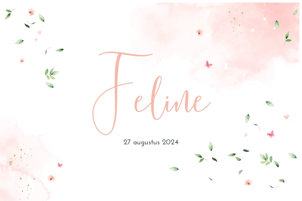 Mooi bijpassend bord om de geboorte van jullie dochter aan te kondigen. Op een witte achtergrond met roze waterverf vlakken staat de naam in sierlijk lettertype centraal. Er omheen staan kleine blaadjes, bloemetjes en vlinders.
