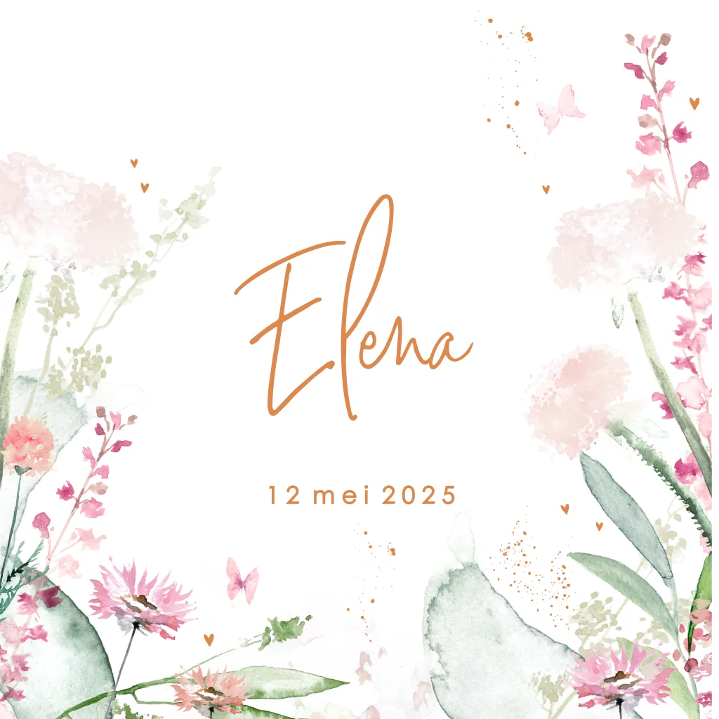 Mooi raambord dat bij het geboortekaartje van jullie dochter past. Op dit vierkante bord met witte achtergrond staat een bloemenrand in roze en groene aquarel. De naam staat centraal in koperkleurig lettertype met daaronder de geboortedatum.