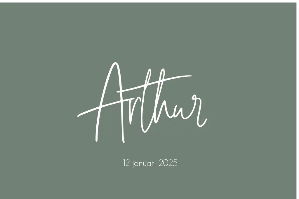 Mooi olijfgroen raambord bijpassend bij het geboortekaartje. De naam staat in hippe witte letters, eronder in kleiner lettertype de geboortedatum.