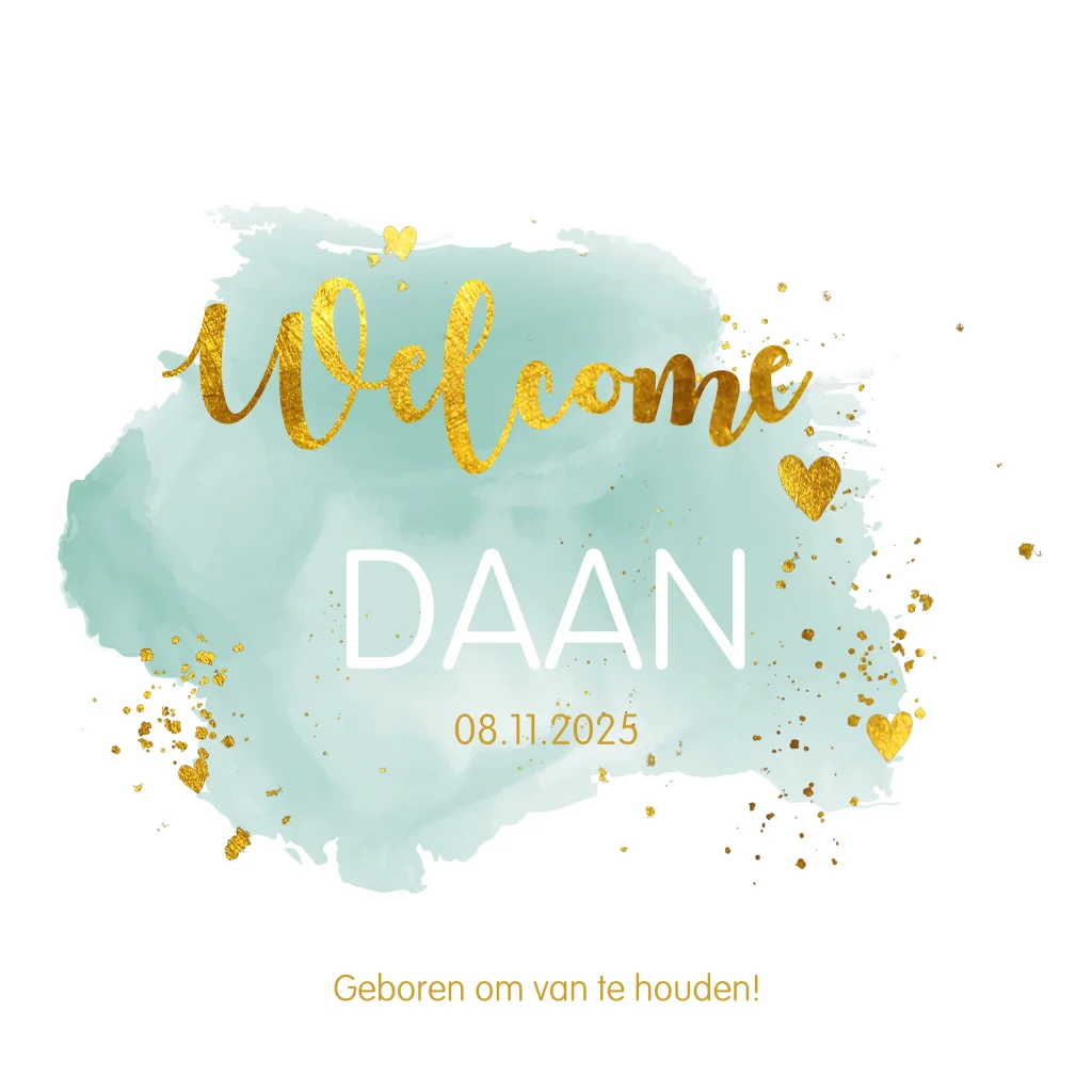Een mooi raambord in de stijl van het geboortekaartje, waarmee je iedereen laat weten dat jullie kleine is geboren! Op de mintgroene waterverf achtergrond staat de naam centraal, daarboven 'welcome' in trendy gouden letters en confetti en hartjes er omheen.