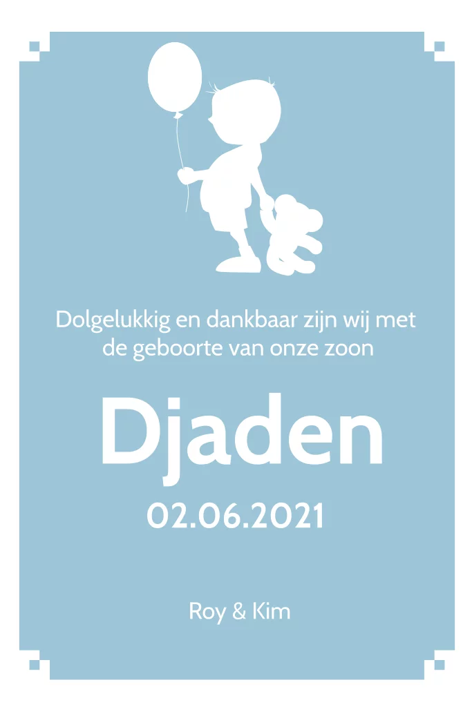 Hip geboortekaartje met het silhouet van een jongentje met een ballon en knuffelbeer. Dit komt mooi naar voren op de grijsblauwe achtergrond! Kleuren en lettertypes kunnen eventueel ook worden aangepast in de online editor.