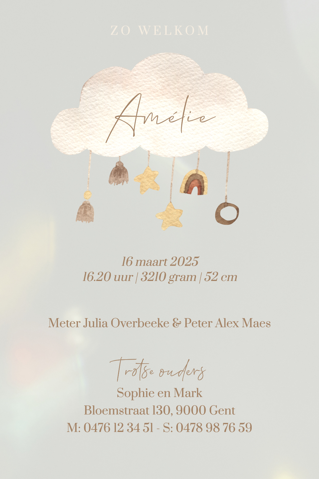 Bijzonder geboortekaartje van acrylglas met een schattig muziekmobieltje van een wolkje.