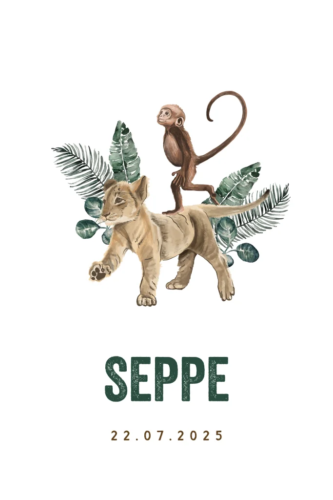 Een hip geboortekaartje met een leeuw en een aapje. De ronde hoeken geven het kaartje een moderne look.| Totaalprijs: 0 |