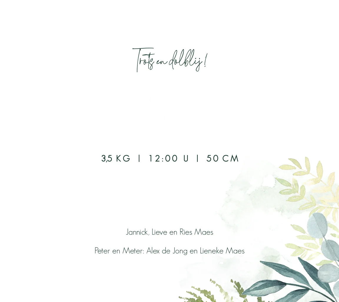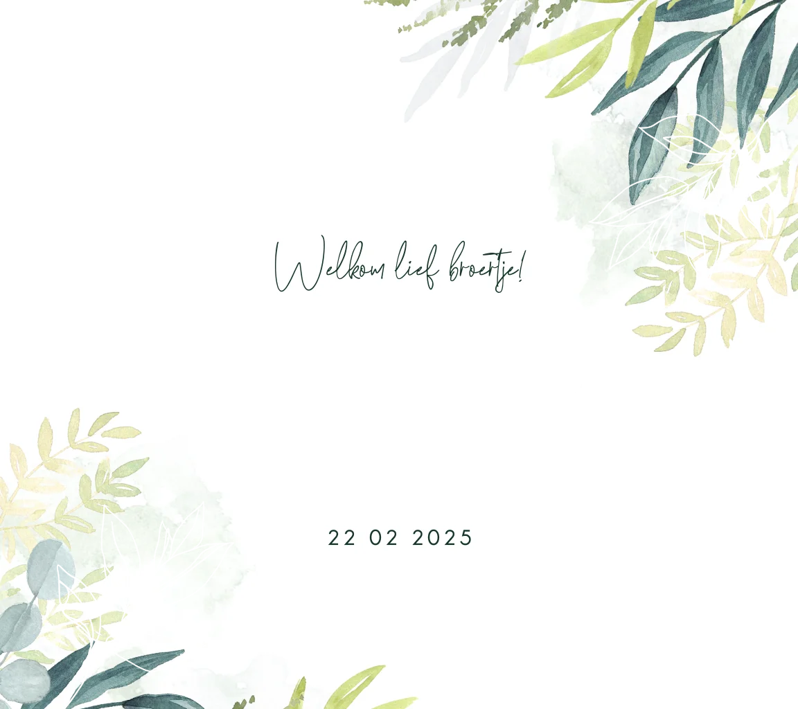 Een botanisch vierkant geboortekaartje met een toefje takjes op aquarel in twee hoeken. De naam van je kindje staat groot in het midden en is van goudfolie. De kleine hartjes geven een lief accent aan dit trendy kaartje!| Totaalprijs: 0 |