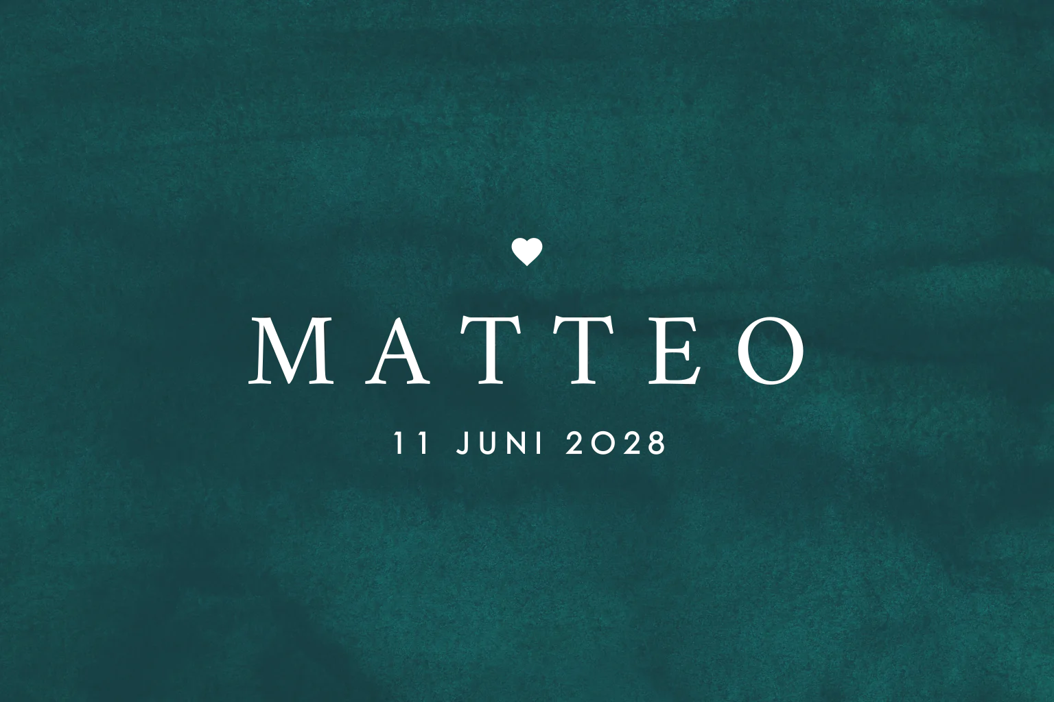 Eenvoudig geboortekaartje met een velvet groene achtergrond die het goudfolie extra goed naar voren laat komen. De naam van jullie zoontje staat in goudfolie gedrukt met een klein hartje er boven.