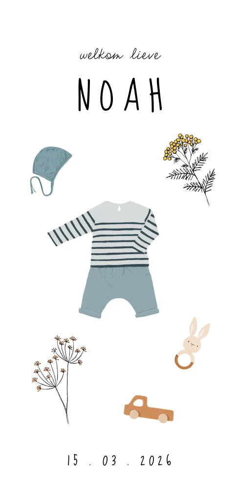 Enkel langwerpig geboortekaartje met kleding, bloemen en speelgoed