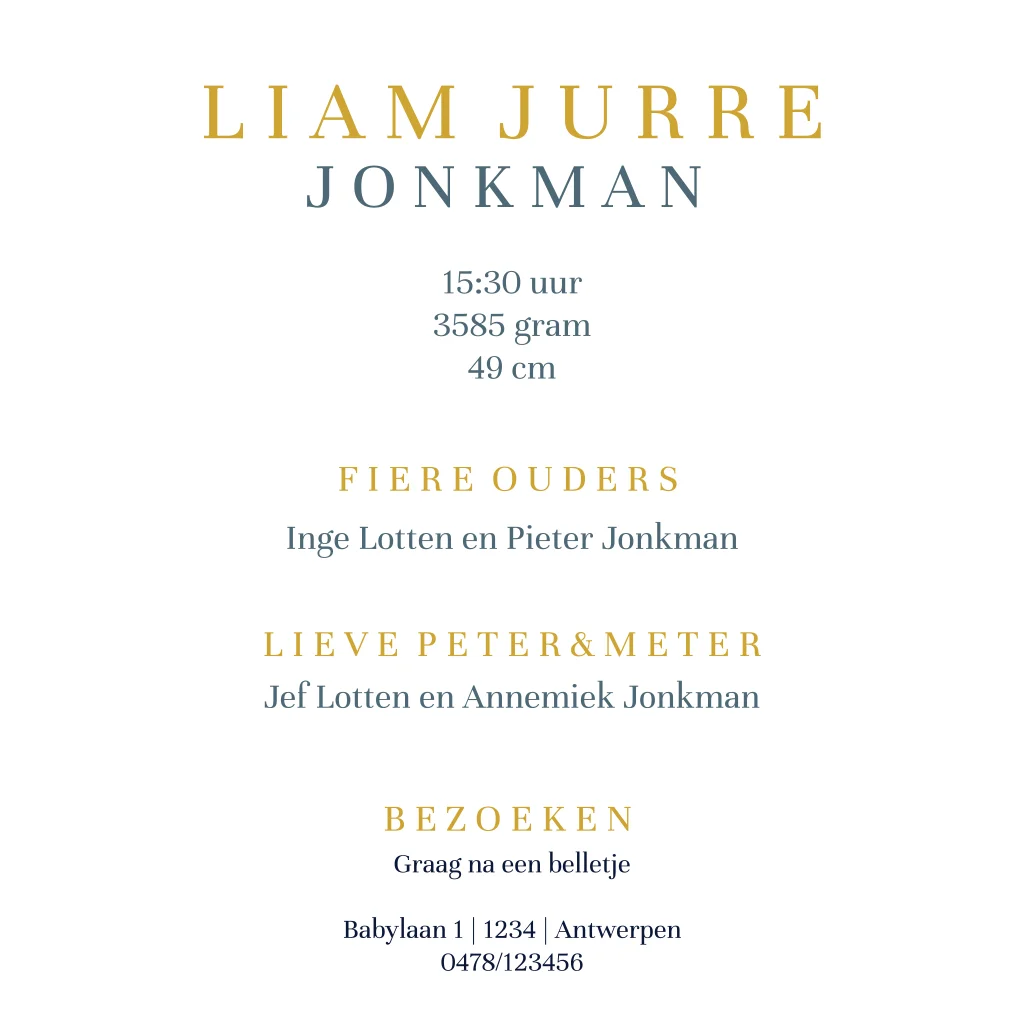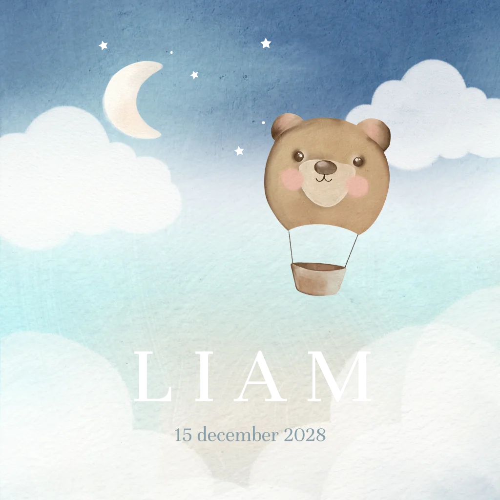 Jullie zijn helemaal in de wolken met de geboorte van jullie zoontje! Grappig geboortekaartje van een beren ballon in een wolkenlucht met een maantje op de achtergrond. Op de witte binnenzijde staat ook een afbeelding van de ballon en de tekst is in bijpassende kleuren.