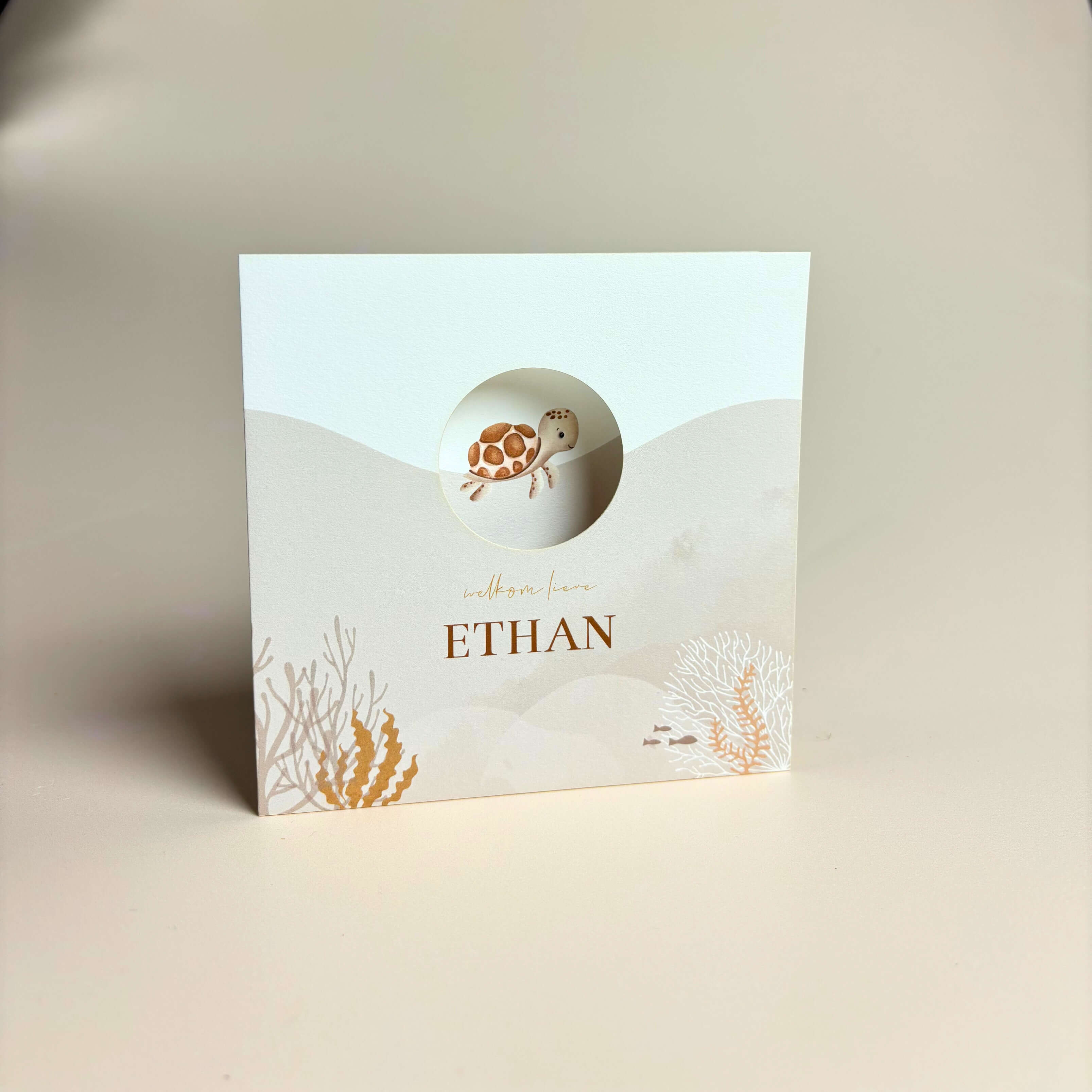 Leuk geboortekaartje voor zowel jongen als meisje. Via het doorkijkje in de kaart is een zeeschildpadje te zien, een speels effect! De zachte kleuren geven een elegante uitstraling. Pas de kaart naar wens aan in online editor.