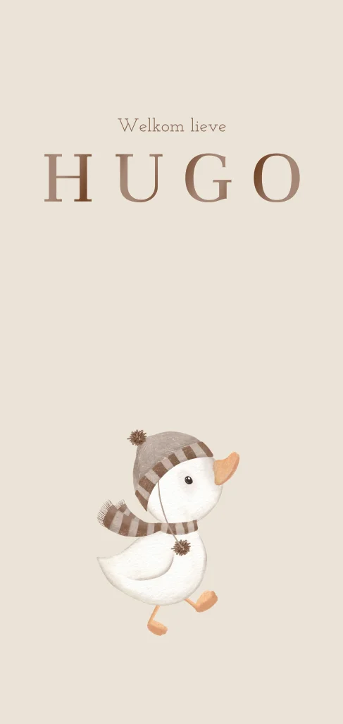 Leuk toch, dit kleine eendje met muts op als je zoontje in de winter wordt geboren?! Het langwerpige geboortekaartje is in rustige kleuren, beige met bruin en wit . De achterkant van het kaartje is wit en ook hier komt het grappige eendje weer terug, pas de tekst naar wens aan in de online editor en bestel een proefdruk.