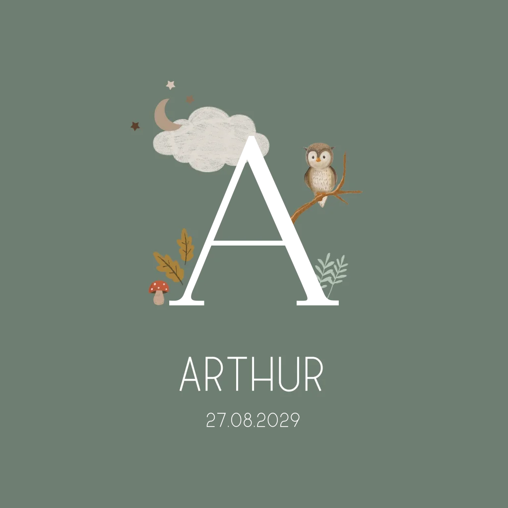 Stoer geboortekaartje met herfstthema met een groene achtergrond. Bij een grote letter in goudfolie zie je herfstblaadjes, paddenstoel en een uiltje. Erboven een dromerig maantje en sterren boven de wolken.