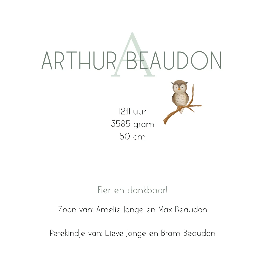 Geboortekaartje jongen met initiaal in goudfolie en uiltje