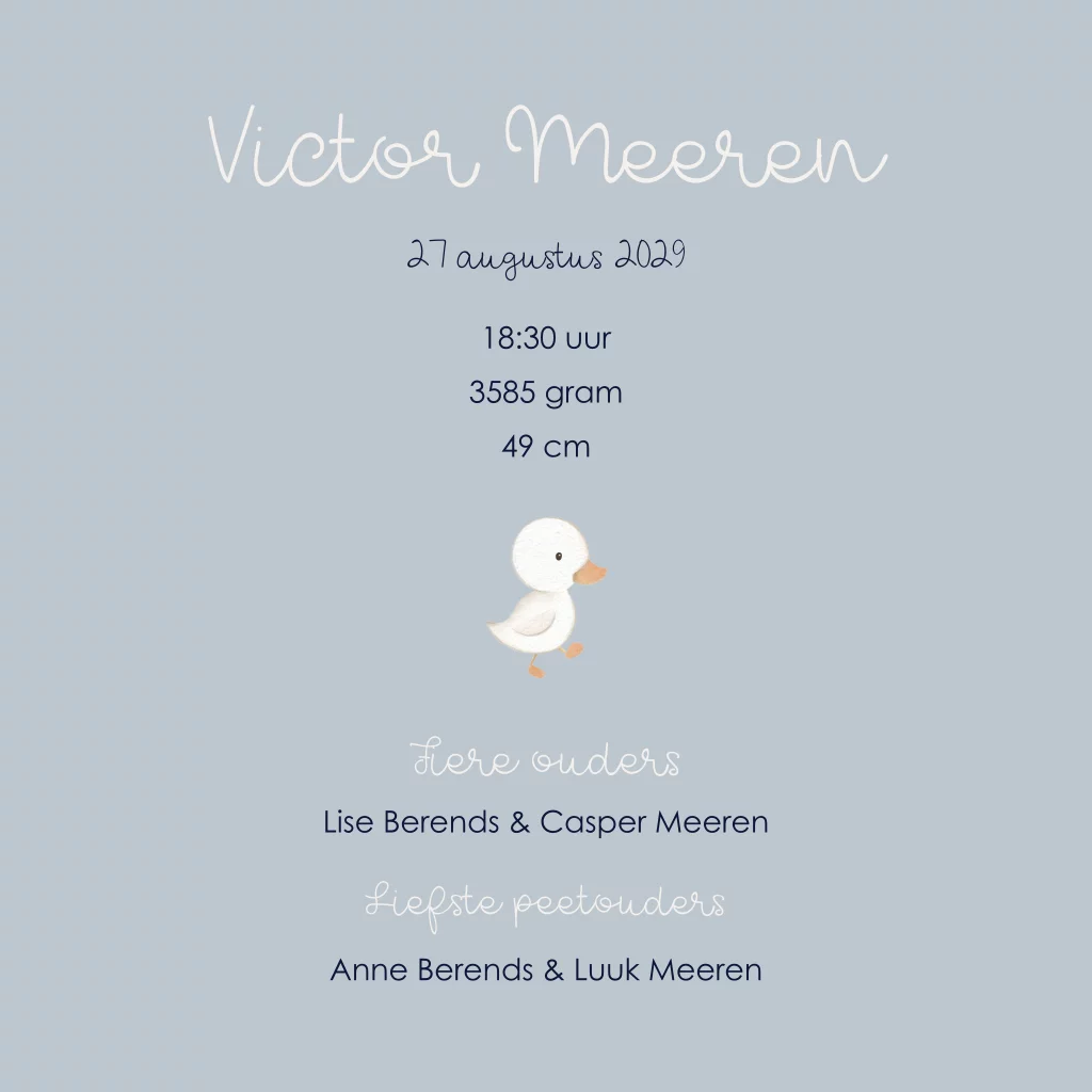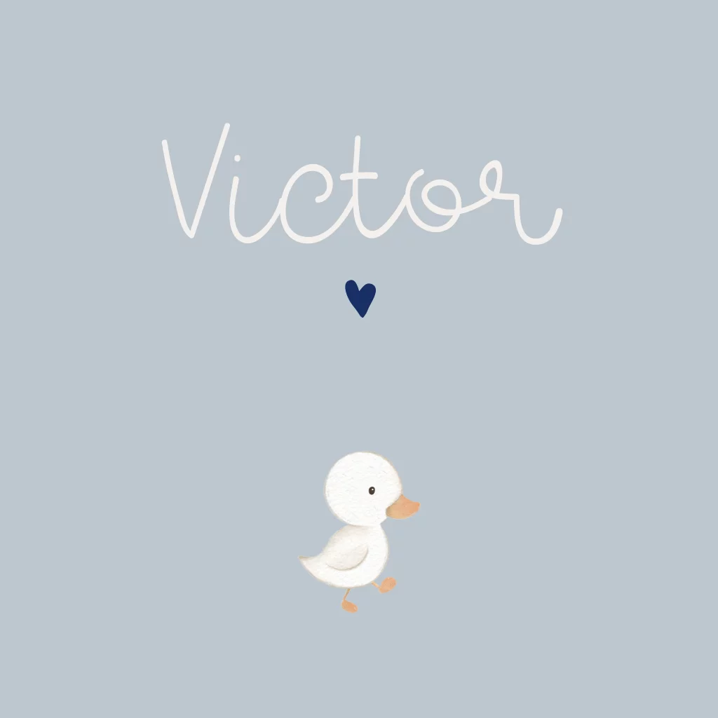Schattig geboortekaartje voor een jongen. op een grijsblauwe achtergrond wandelt een leuk klein eendje. De naam staat in sierlijke witte letters met een klein blauw hartje eronder. Pas de kaart naar wens aan in de online editor.