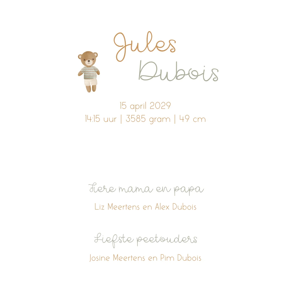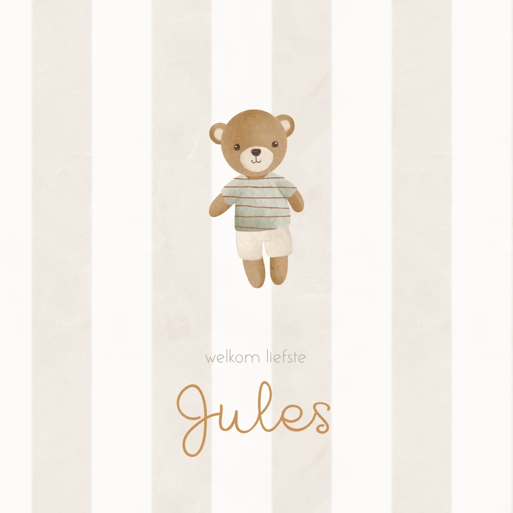 Schattig geboortekaartje voor jullie zoon. Op de kaart staan strepen in zachte kleuren en op de voorgrond staat een illustratie van een knuffelbeertje. Pas de kaart naar eigen wens aan in de online editor.