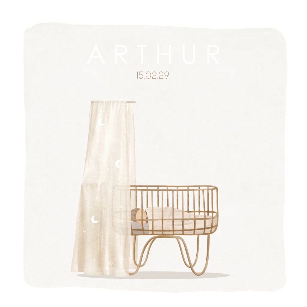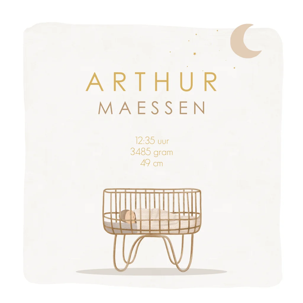 Een geboortekaartje om bij weg te dromen. Een baby ligt te slapen in een wiegje met een prachtig hemeltje. De maantjes, sterretjes en naam van jullie kleintje zijn in goudfolie voor een luxe finish. Pas kleuren of lettertypes eenvoudig aan in de online editor.
