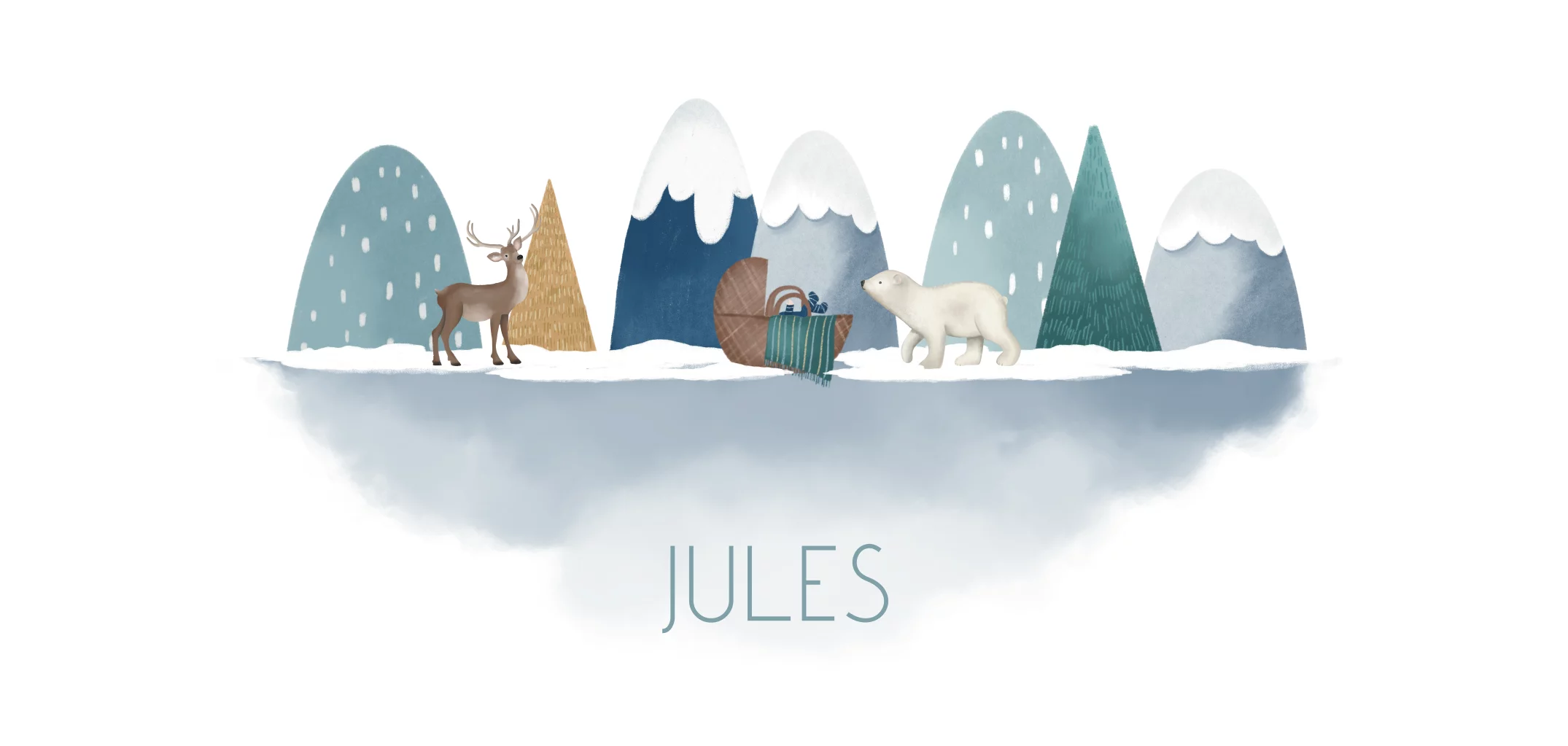 Leuk geboortekaartje voor een jongen die in de winter wordt geboren: in een aquarel blauw landschap met bomen zie je een rendier en een ijsbeer die nieuwsgierig zijn naar het mandje met kind. Pas de kaart naar wens aan in de online editor.