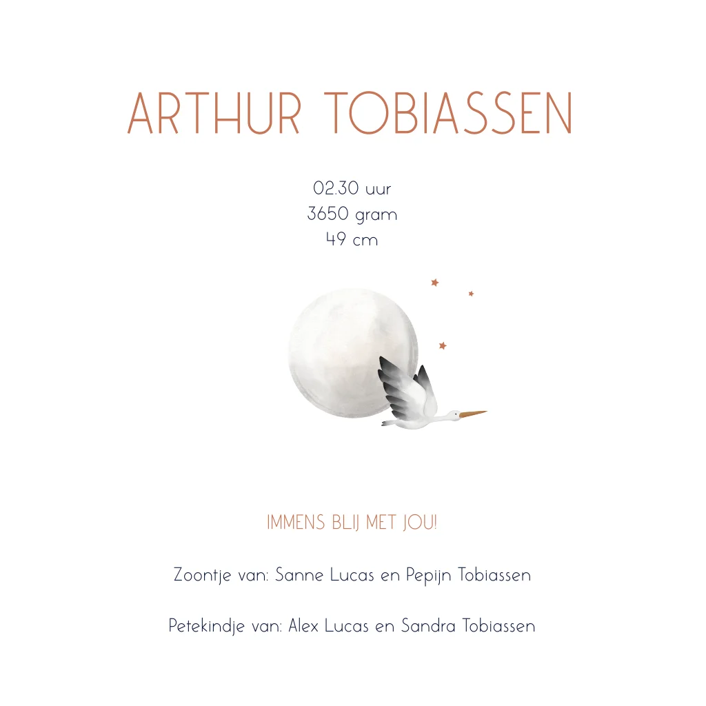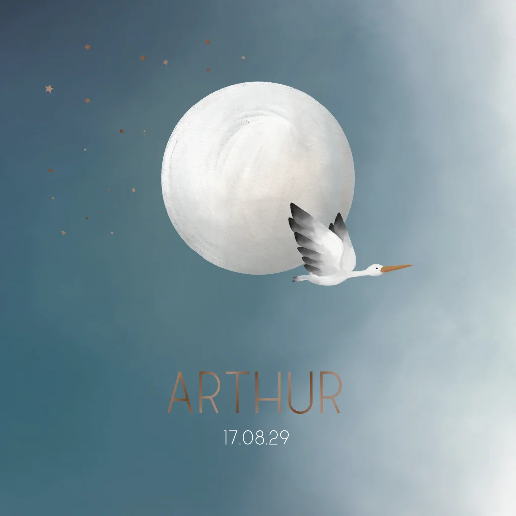 Stijlvol geboortekaartje nacht met maan, ooievaar en sterren. Het hoogglans geeft een luxe uitstraling. Eenvoudig te personaliseren in onze online editor.