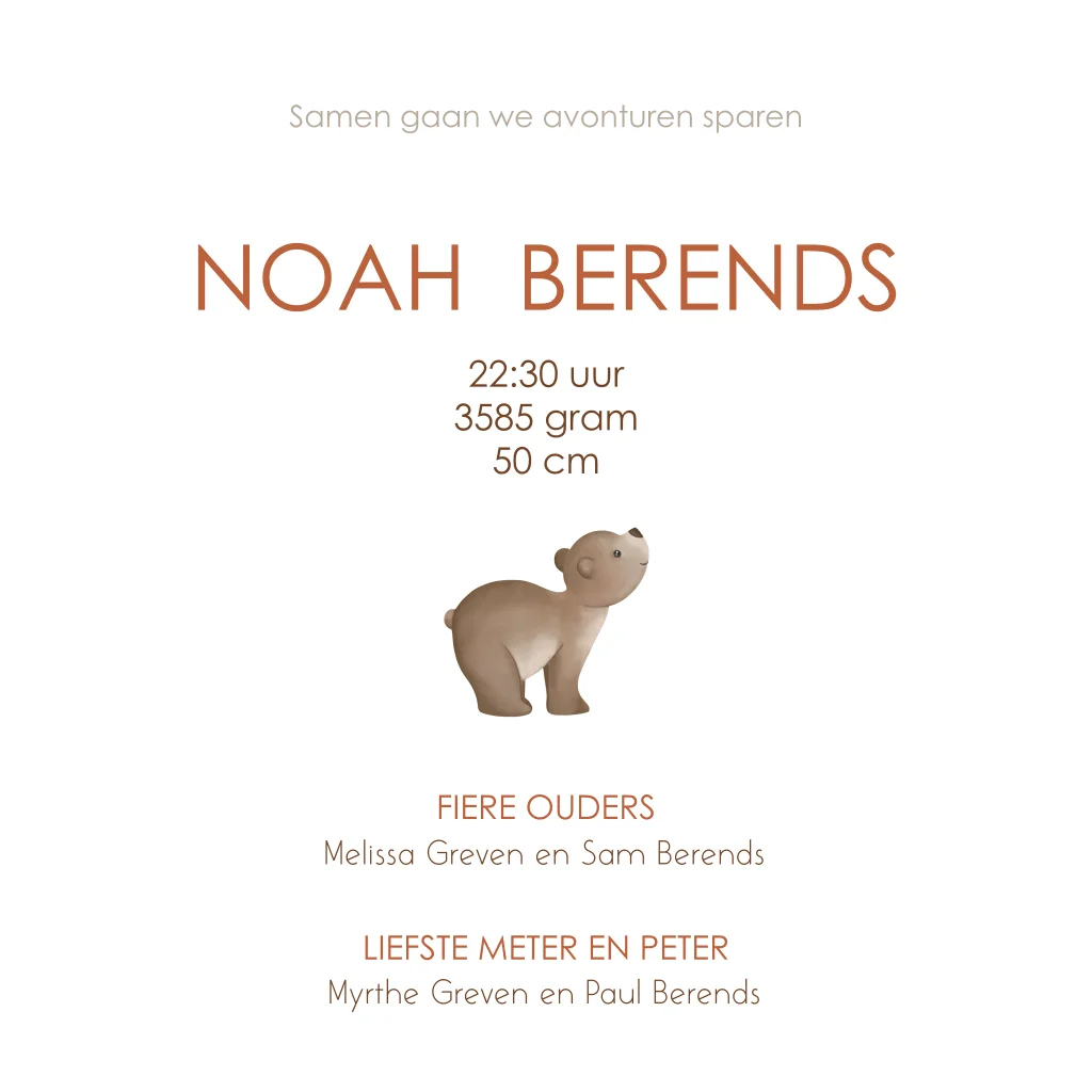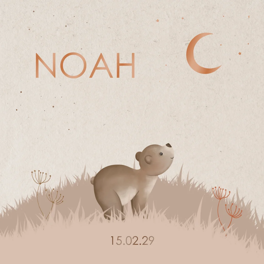 Neutraal geboortekaartje in beige tinten met een lief beertje in een graslandschap. Boven het beertje een nachtelijke hemel met maan en sterren in hoogglans, ook de naam staat in luxe foliedruk.