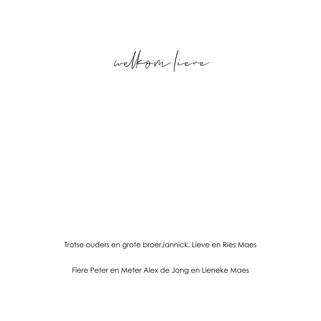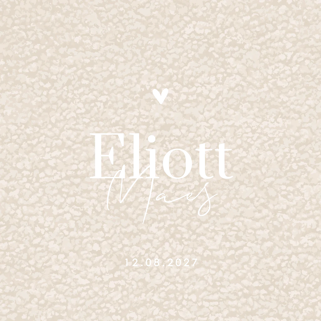 Trendy geboortekaartje voor een jongen of meisje met een beige structuurlook achtergrond en tekst in roségoudfolie. Op de voorkant de naam en datum beide in roségoudfolie, op de witte binnenzijde staan de naam en de icoontjes ook in roségoudfolie, gecombineerd met zwarte tekst.