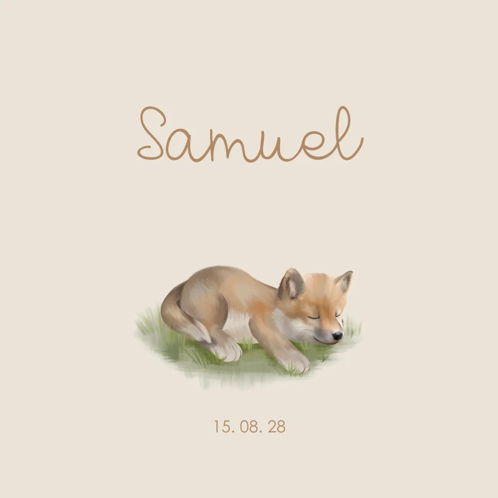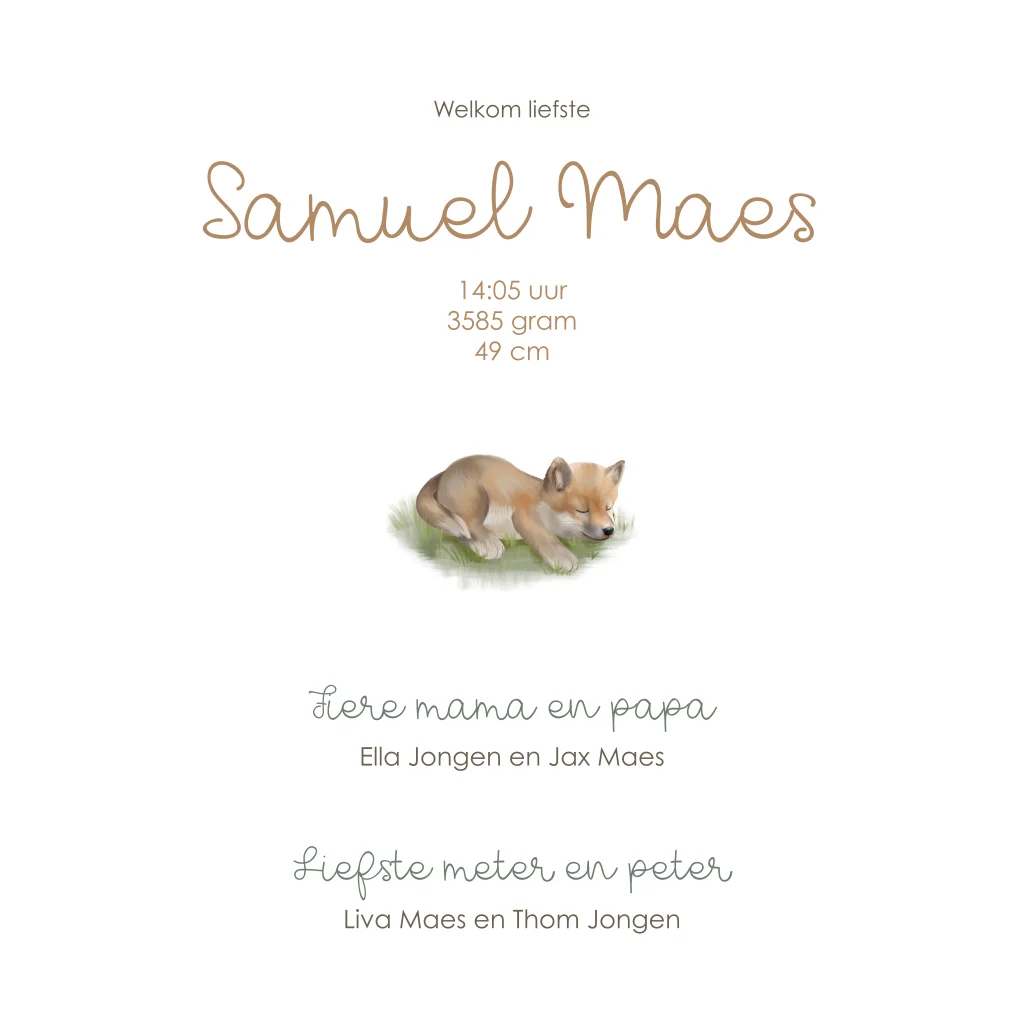 Lief geboortekaartje met slapend wolfje. Prachtig te combineren met bijpassende producten. Pas de kaart naar eigen wens aan in de online editor.