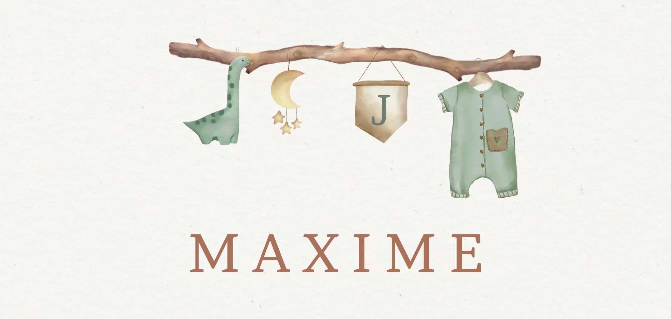 Leuke geboortekaart met een tak waaraan een dino, een maan, een vaandel en een pakje hangen. Maak met deze kaart de geboorte van jullie stoere jongen bekend.