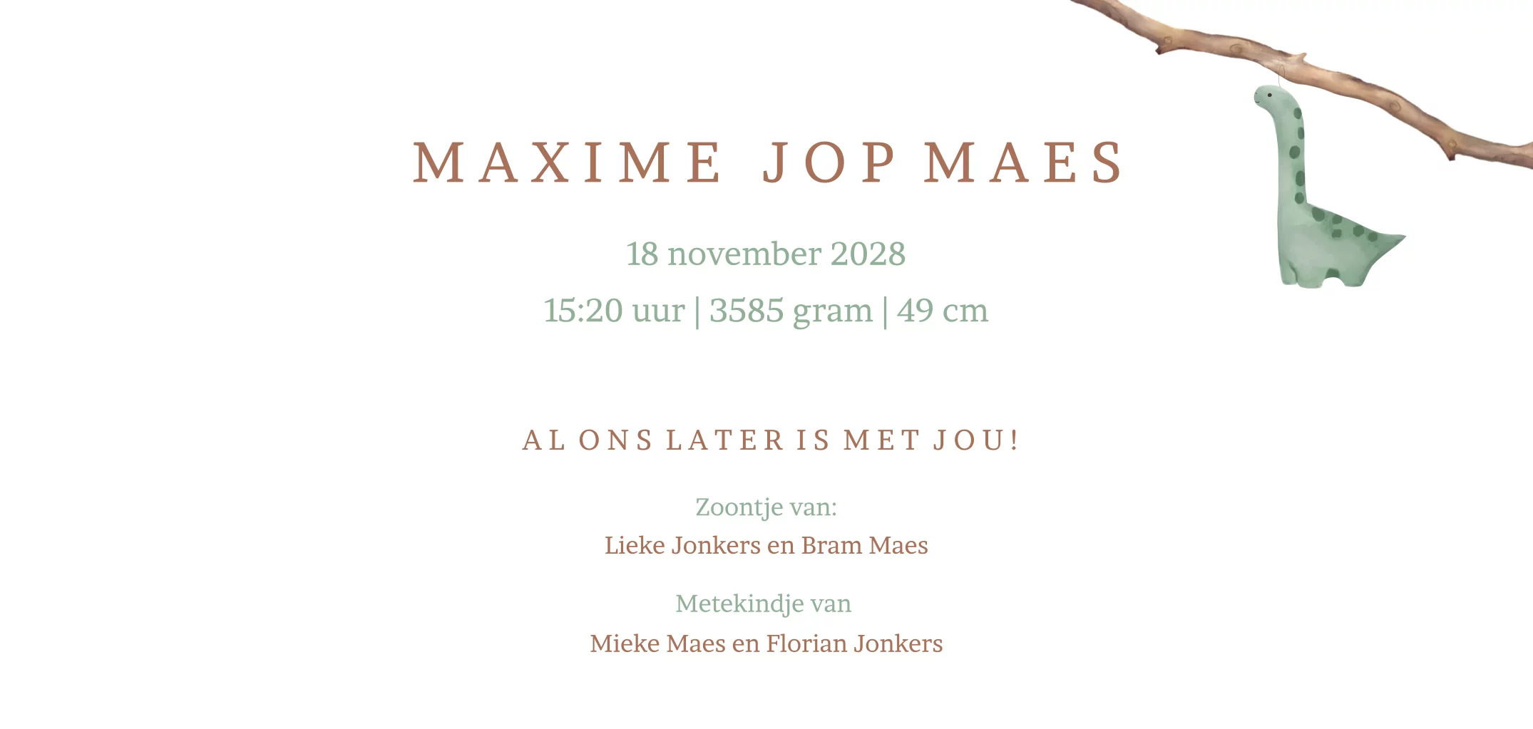 Leuke geboortekaart met een tak waaraan een dino, een maan, een vaandel en een pakje hangen. Maak met deze kaart de geboorte van jullie stoere jongen bekend.| Totaalprijs: 0 |