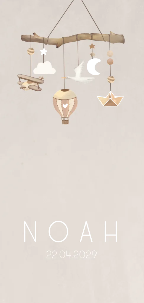 Lief langwerpige geboortekaartje met verschillende illustraties aan een tak. De naam van jullie kindje schittert in goudfolie. Stijlvol!
