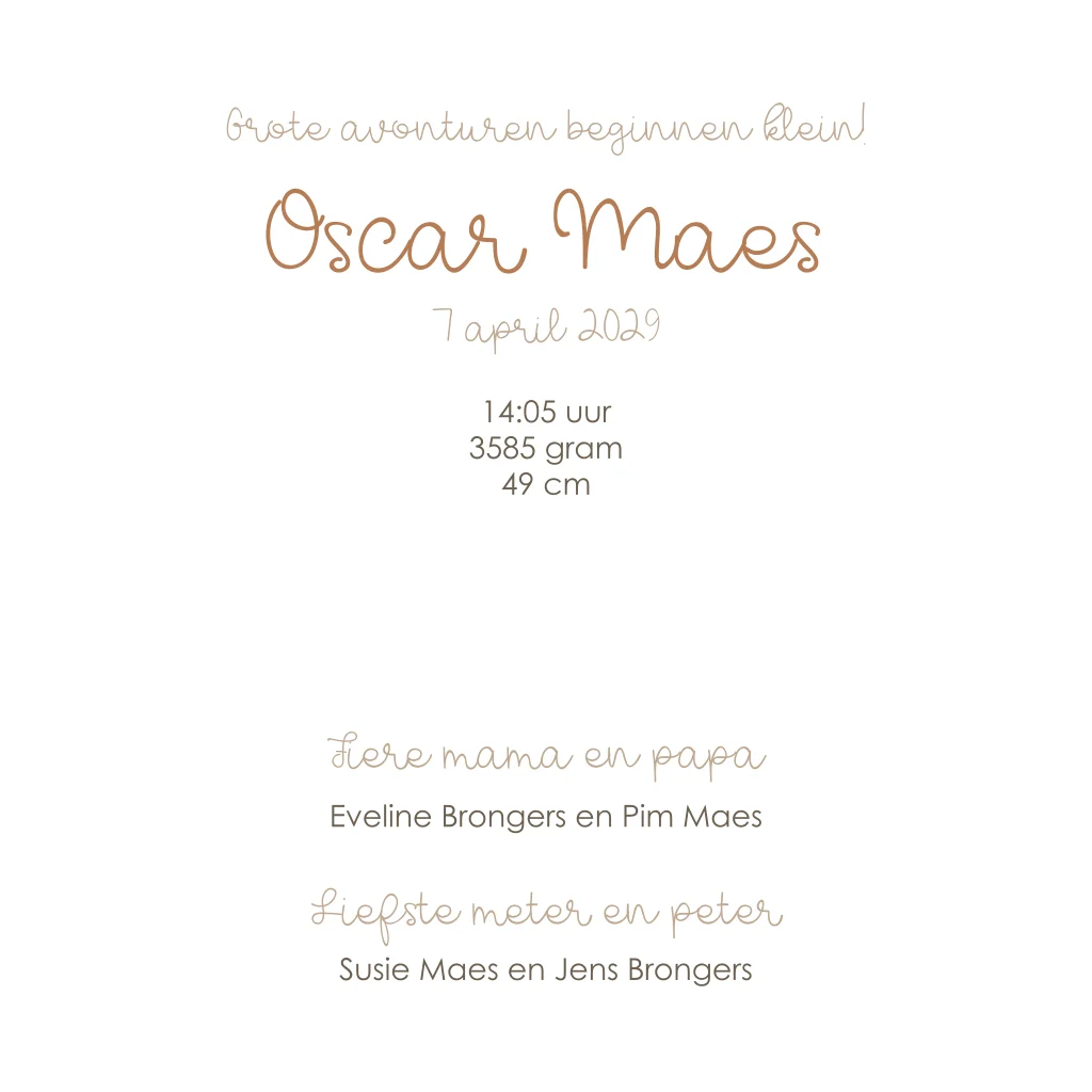 Lief geboortekaartje met tijgertje en vlinder. Eenvoudig aan te passen in onze online editor.Totaalprijs: 0 |