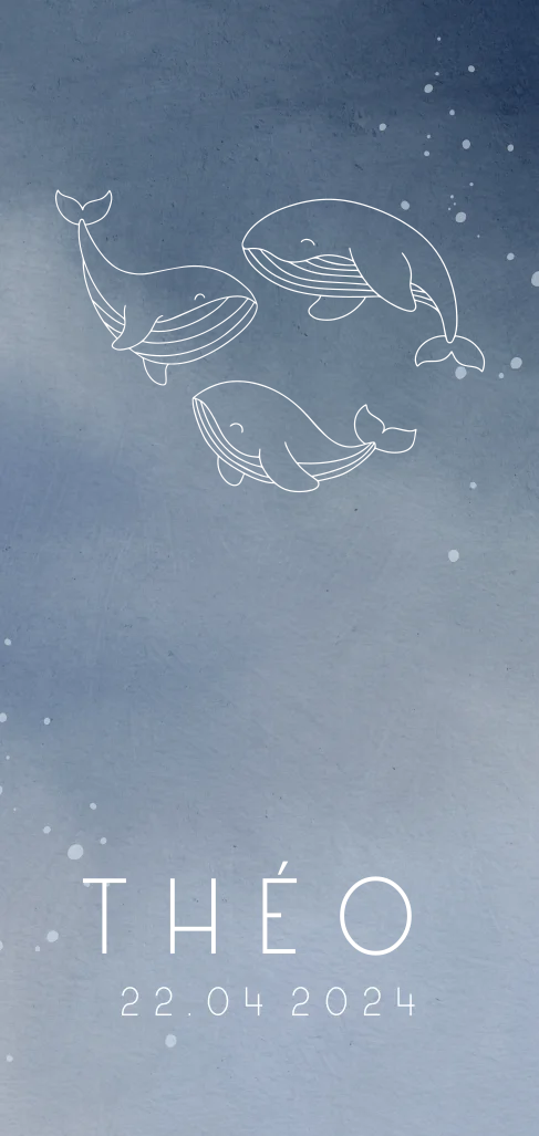 Elegant geboortekaartje met een blauwe achtergrond. Op de langwerpige kaart zwemt een walvis gezin. Zowel de walvissen als de naam van jullie kindje is in goudfolie gedrukt en geeft een luxe uitstraling.| Totaalprijs: 0 |