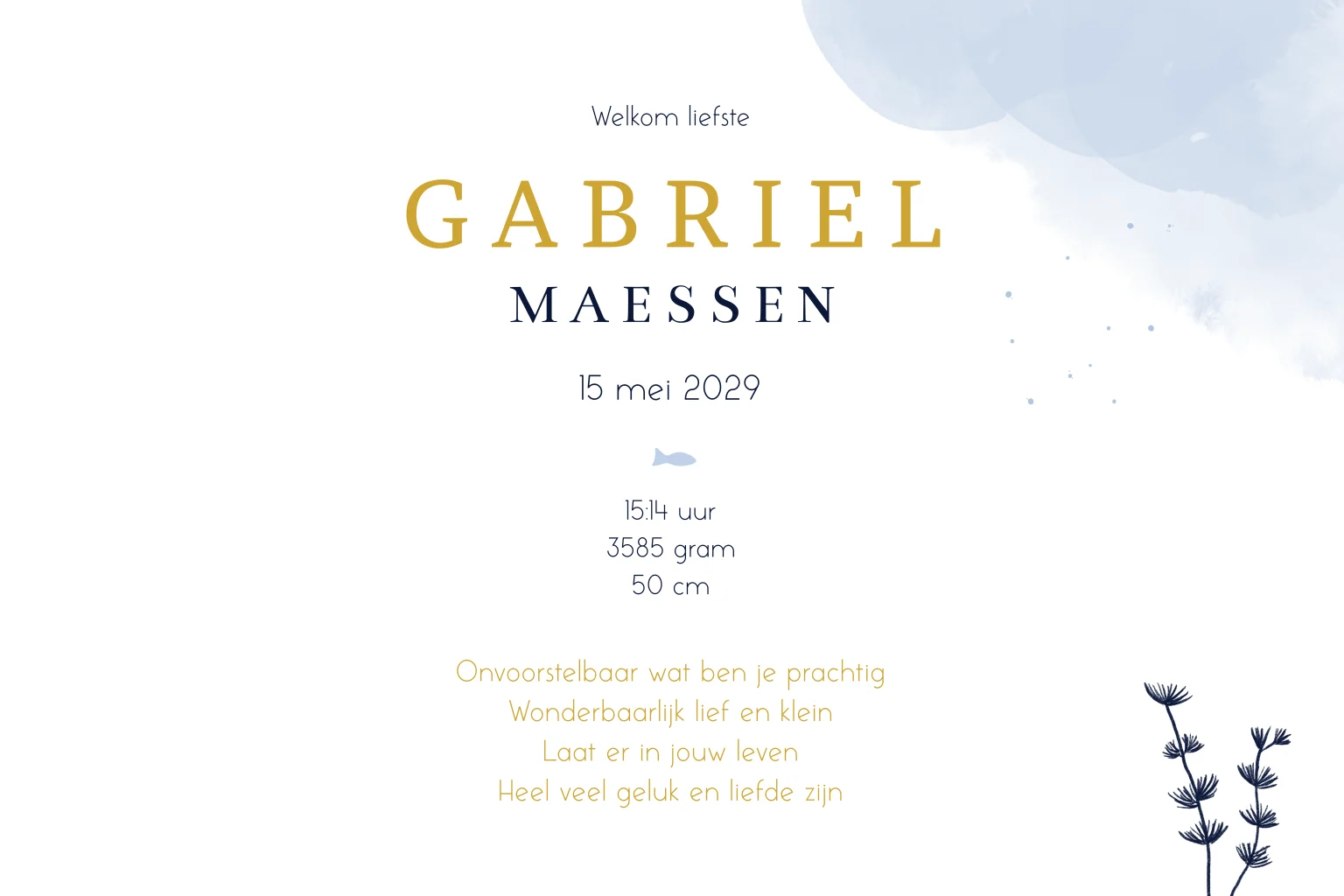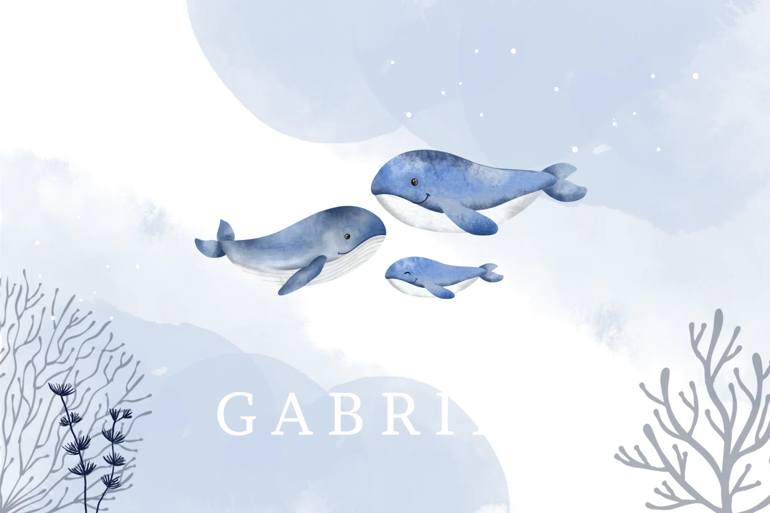 Stijlvolle geboortekaart met walvissen gezin. De liggende kaart heeft een mooie blauw met witte achtergrond in aquarelstijl. De letters in goudfolie geven een luxe uitstraling.| Totaalprijs: 0 |