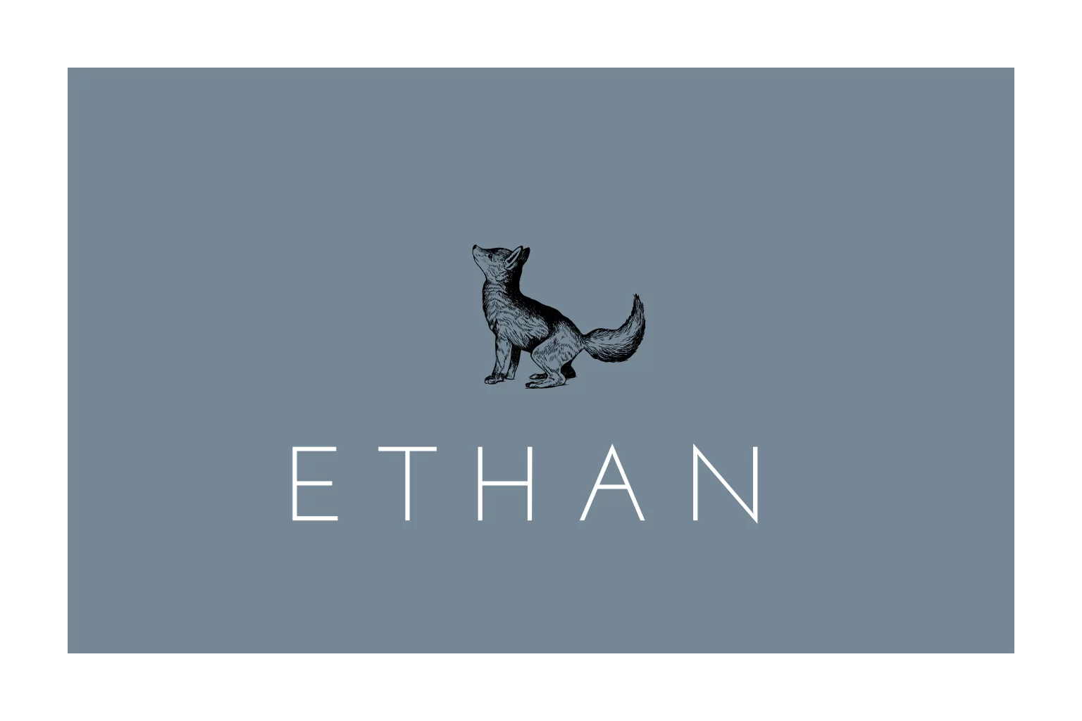 Hip geboortekaartje voor een jongen, met een getekend vosje en minimalistische typografie, op een blauwe achtergrond.