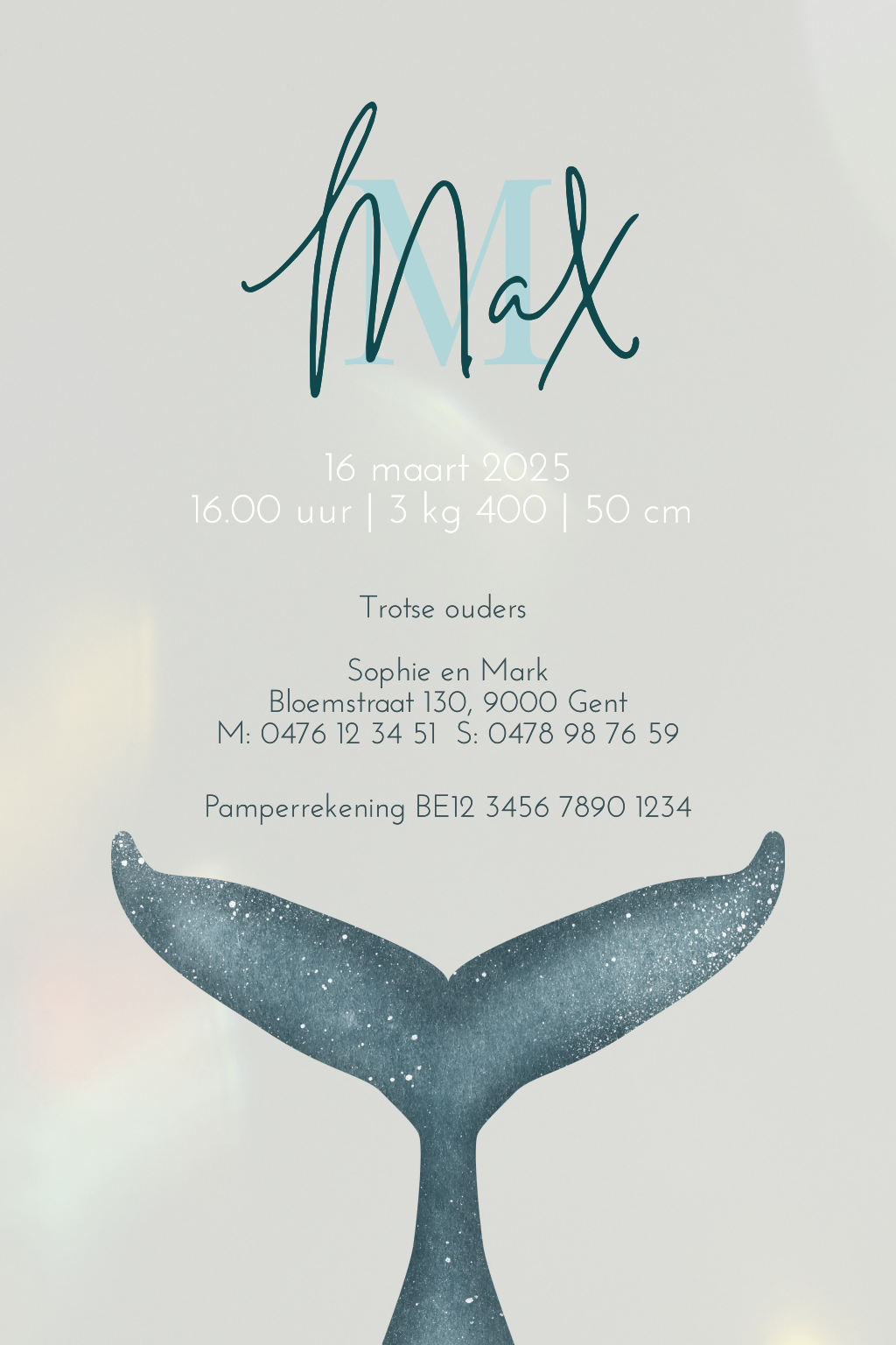 Bijzonder geboortekaartje van acrylglas voor wanneer jullie een uniek kaartje zoeken voor jullie kleintje. Op dit stoere kaartje staat de staartvin van een walvis. Daarboven staat de naam van je kindje met op de achtergrond de beginletter van de naam in lichtblauw.
