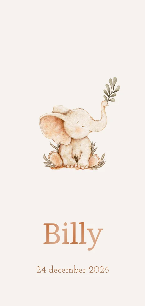 Elegante geboortekaart met olifantje in beige tinten. Zet de naam van jullie pasgeboren kleintje met hoogglans letters op de kaart.