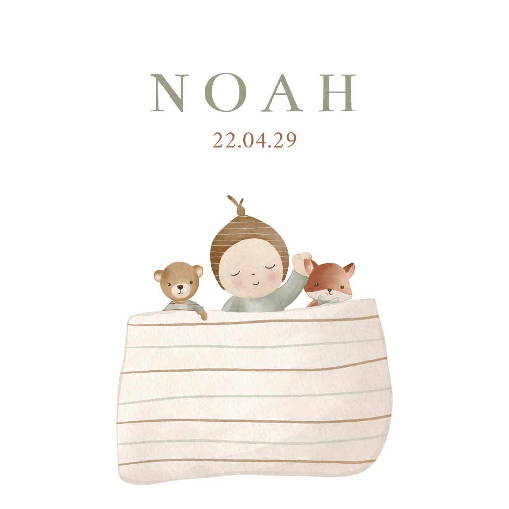 Een geboortekaartje om bij weg te dromen. Op het witte kaartje staat een illustratie van een baby die heerlijk ligt te slapen ondereen dekentje. Lettertypes en kleuren zijn eenvoudig naar wens aan te passen in de online editor.