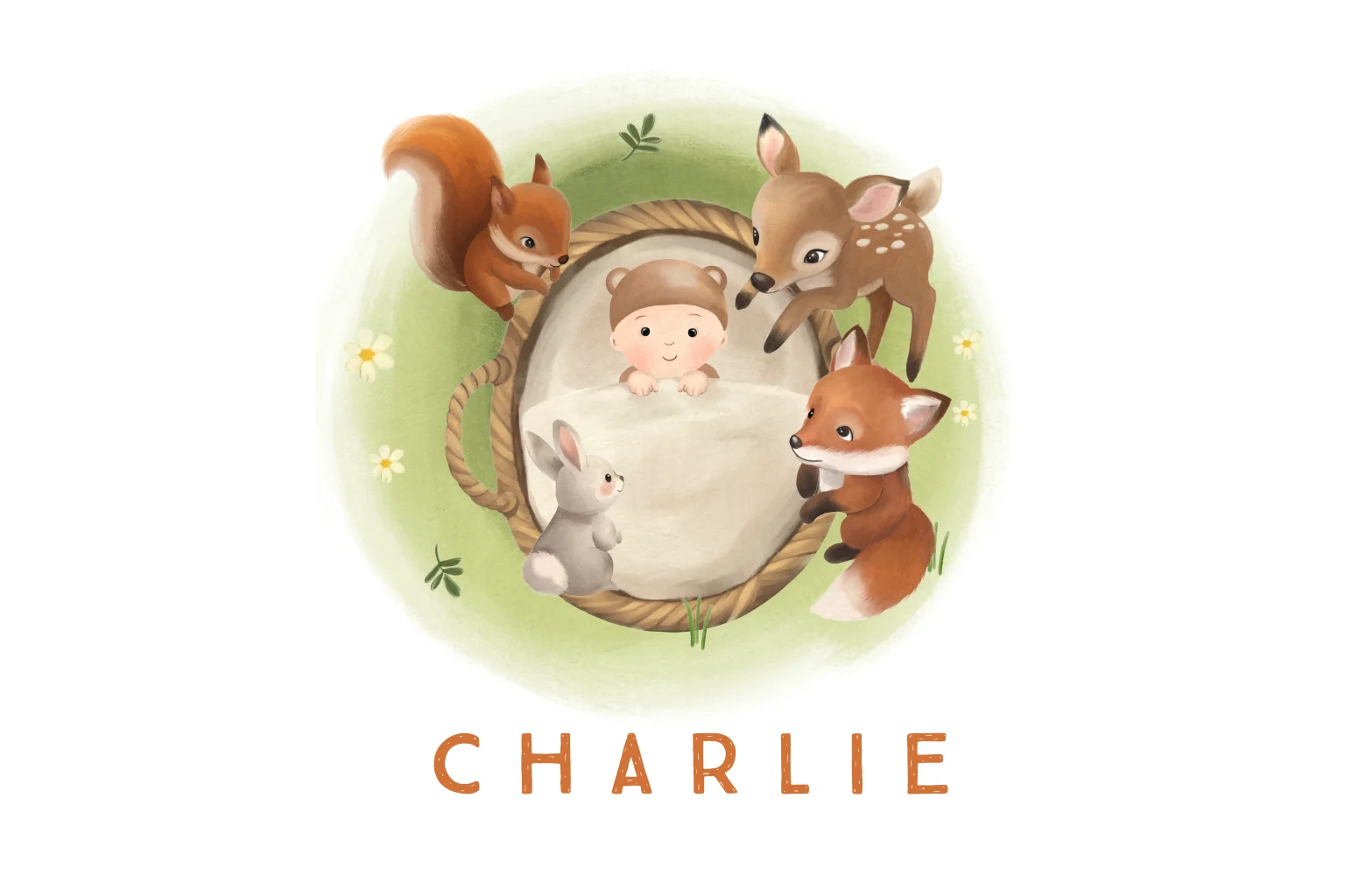 Een lief geboortekaartje voor jouw kindje. Op het kaartje zie je een illustratie van een baby in een mandje omringd door lieve bosdieren in het gras. Het geboortekaartje heeft een vierkant formaat. Pas het ontwerp naar wens aan in de online editor.