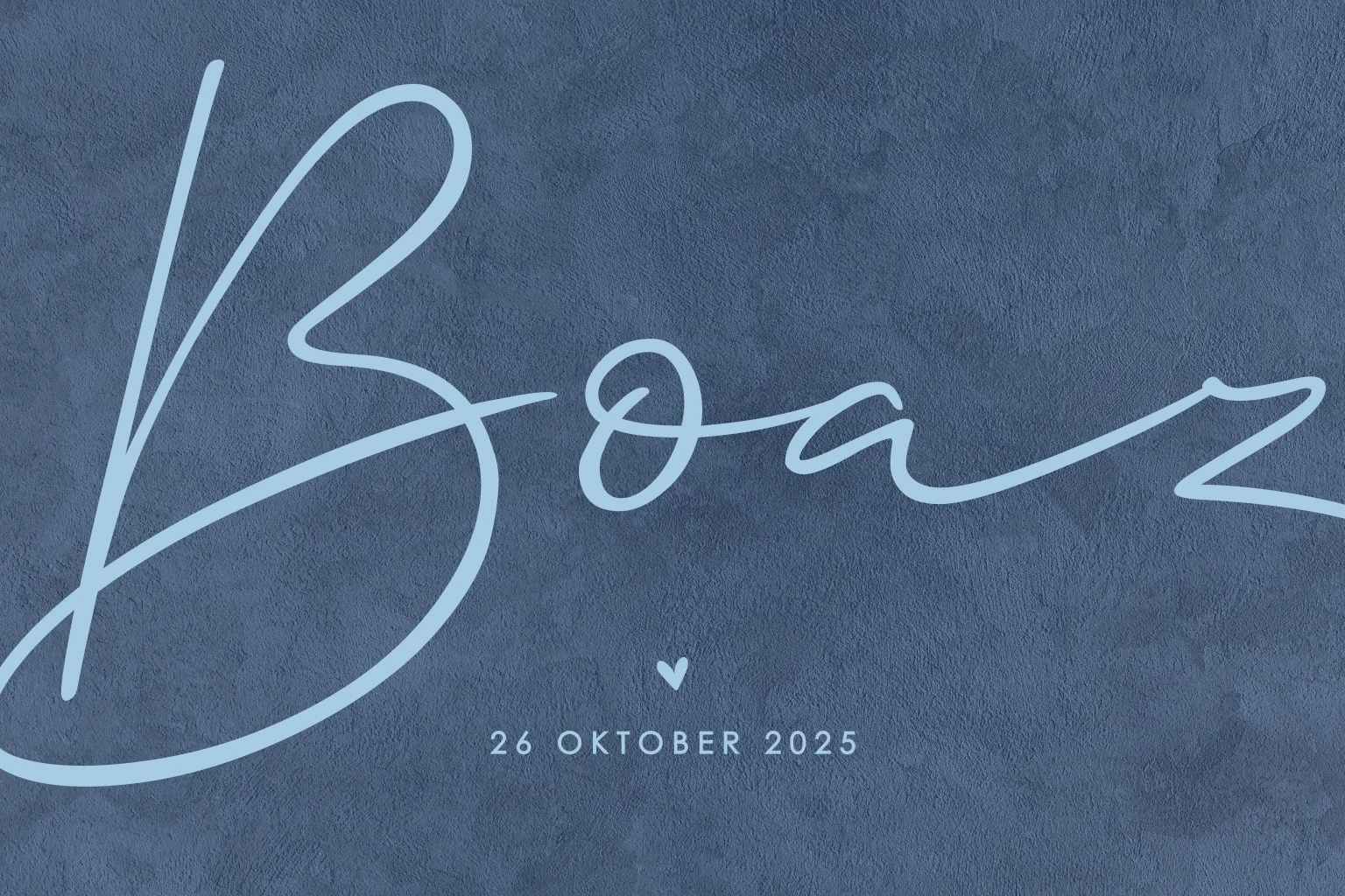 Stoer geboortekaartje met blauwe velvet-look achtergrond en sierlijk lettertype.