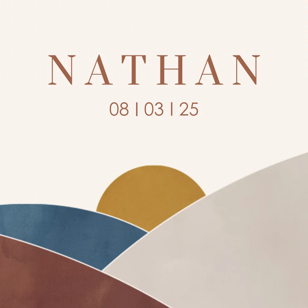 Trendy geboortekaartje met bohemian landschap met waterverf textuur.Plaats zelf de teksten en elementen eenvoudig op de juiste plek in onze opmaaktool. Heb je hier hulp bij nodig? Neem gerust even contact met ons op!