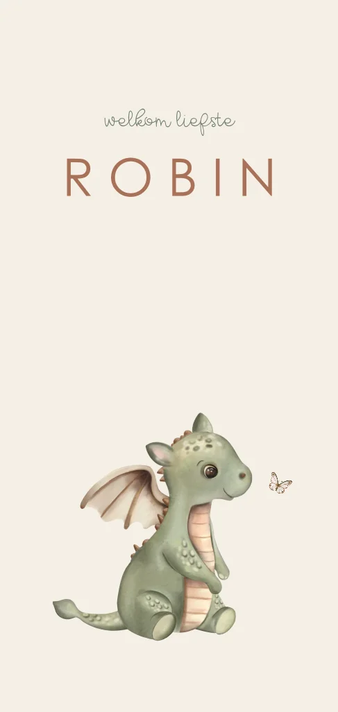 Langwerpig geboortekaartje met draakje en vlindertje. Leuk met bijpassende sticker.