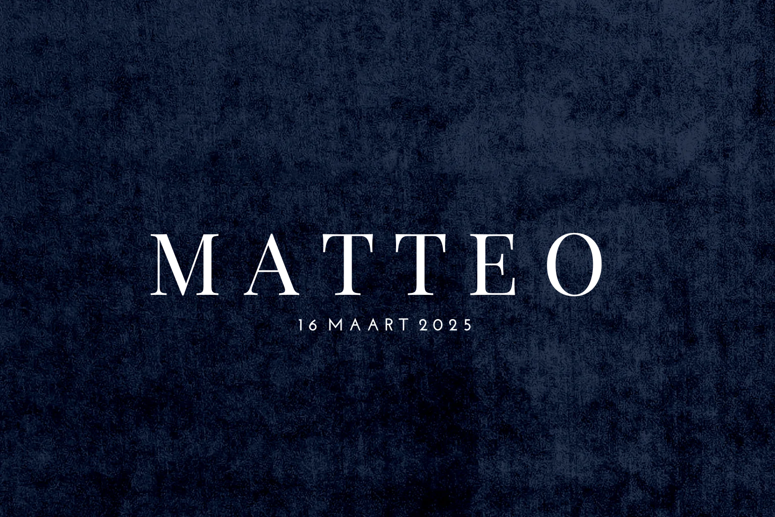 Dit hippe babykaartje heeft een mooi eenvoudig ontwerp. De naam van jullie zoon wordt gedrukt in goudfolie. Het kaartje heeft een trendy velvet look achtergrond in donkerblauw. Dit geeft een warme en stijlvolle uitstraling aan dit unieke geboortekaartje! De teksten en kleuren kun je naar wens aanpassen in de online editor.