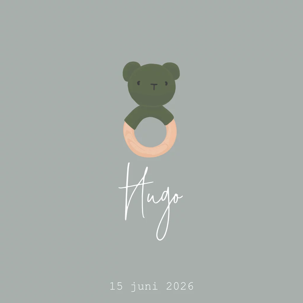 Leuk geboortekaartje voor een jongen, op de grijzige achtergrond staat de naam in trendy typografie in wit. Boven de naam een groen beertje als bijtring. Op de achterkant kun je een eigen foto uploaden in de online editor, daar pas je ook de tekst naar wens aan.