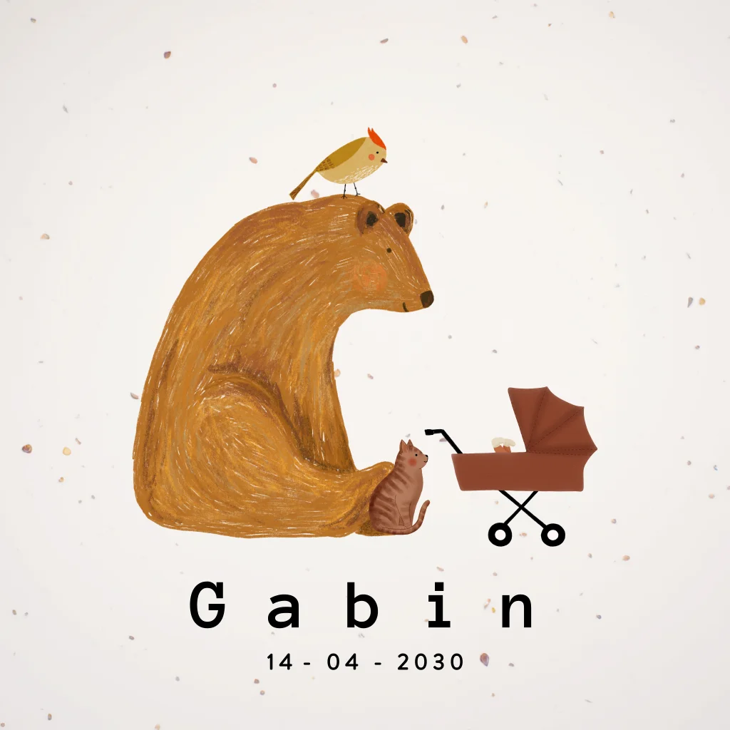 Geboortekaartje met grote beer en kleine vogel op zn hoofd. De beer kijkt een kinderwagen in waar een babytje in ligt.