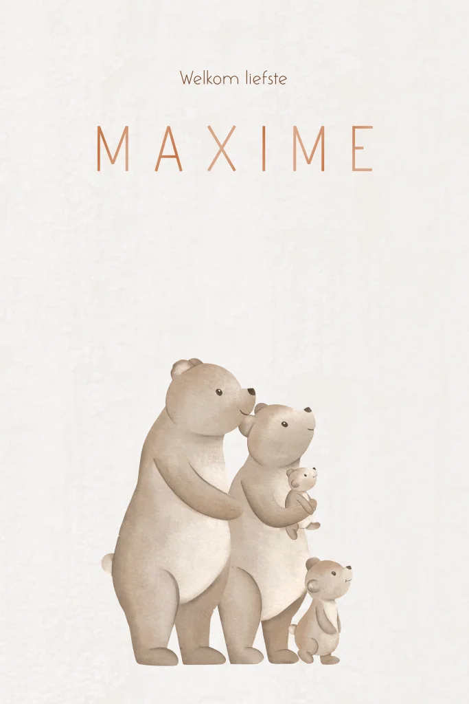 Lief geboortekaartje met de naam van jullie kleintje in hoogglans en een berenfamilie. Extra leuk voor een broertje of zusje door de twee kleine beertjes die ook aan de binnenkant staan.