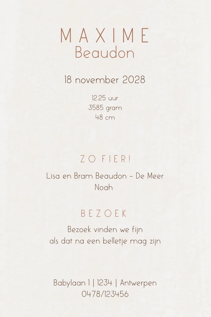 Lief geboortekaartje met de naam van jullie kleintje in hoogglans en een berenfamilie. Extra leuk voor een broertje of zusje door de twee kleine beertjes die ook aan de binnenkant staan.Totaalprijs: 0 |