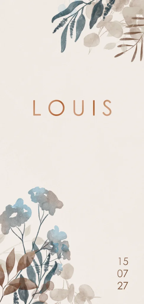 Dit elegante geboortekaartje bevat letters in hoogglans op een beige achtergrondkleur. In de hoeken staan watercolour bloemetjes en takjes in blauwe en bruine kleuren. Zo heeft dit kaartje een rustige en lieve uitstraling.