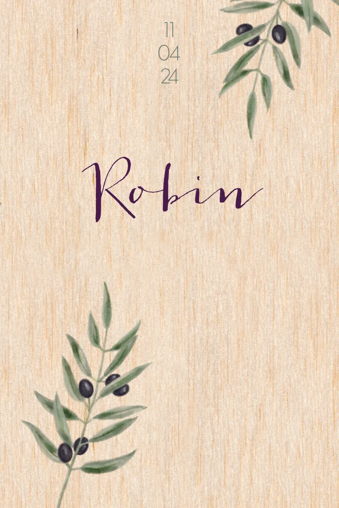 Originele babykaart met een illustratie van olijventakjes. Deze kaart wordt op echt hout gedrukt. Je kunt de tekst en de kleur naar wens aanpassen in de online editor.| Totaalprijs: 0 |