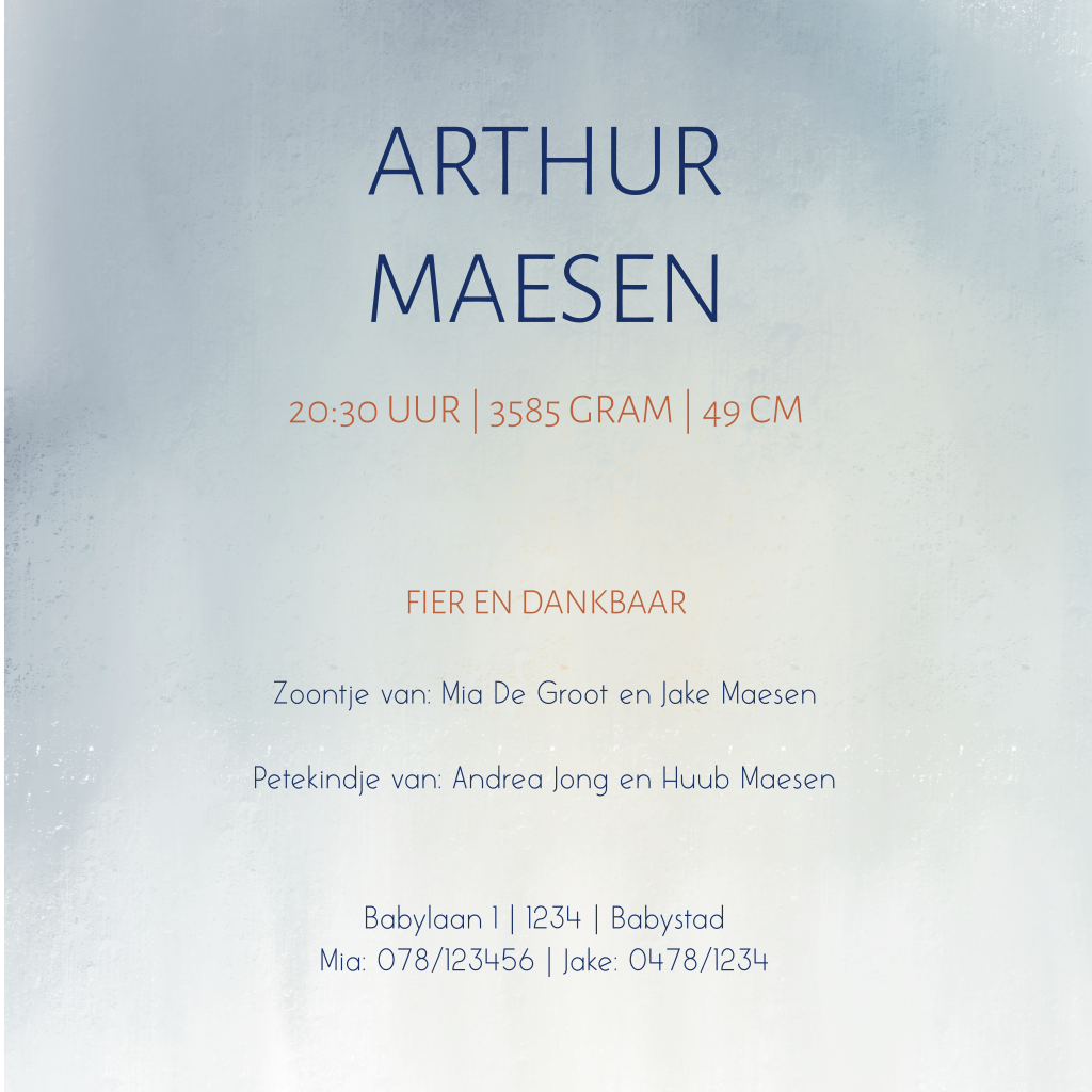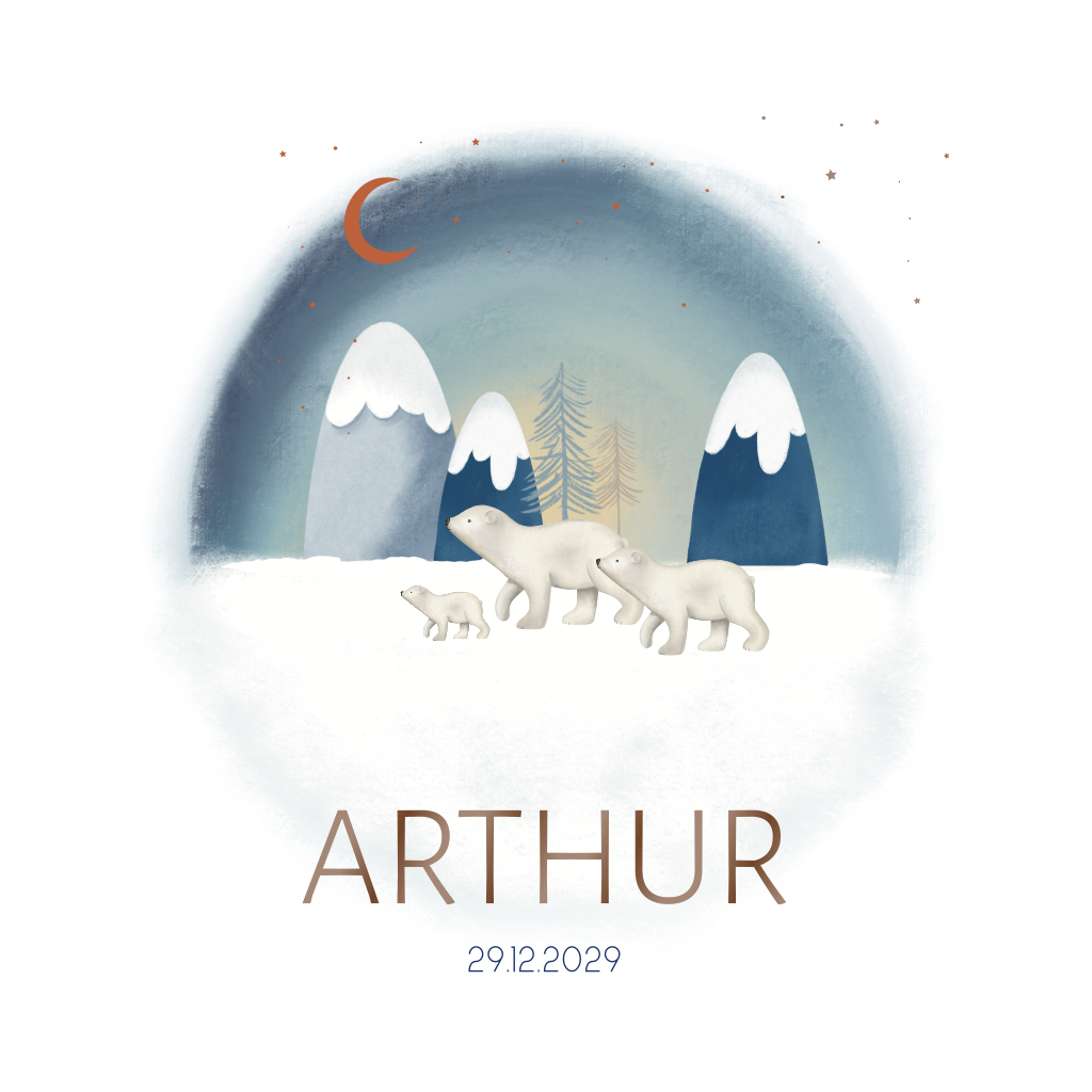 Wordt jullie kleintje in de winter geboren? Dan is dit stijlvolle geboortekaartje perfect. Een ijsberenfamilie loopt door de sneeuw onder een sterrenhemel. De naam van jullie kindje wordt in hoogglans gedrukt.