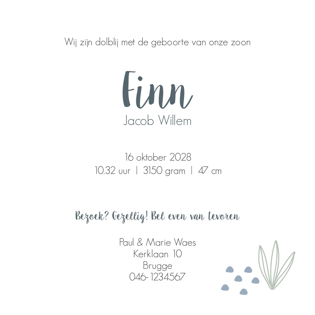 Een grappig blauw olifantje wijst met zijn slurf naar de naam van jullie zoontje, hoe leuk is dat! De oor van de olifant is zwart met witte stipjes, het design komt ook aan de binnenzijde terug. De tekst op dit witte kaartje is in bijpassende kleuren en kan eenvoudig zelf worden aangepast in de online editor.
