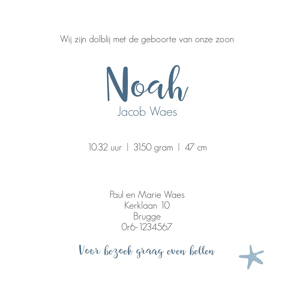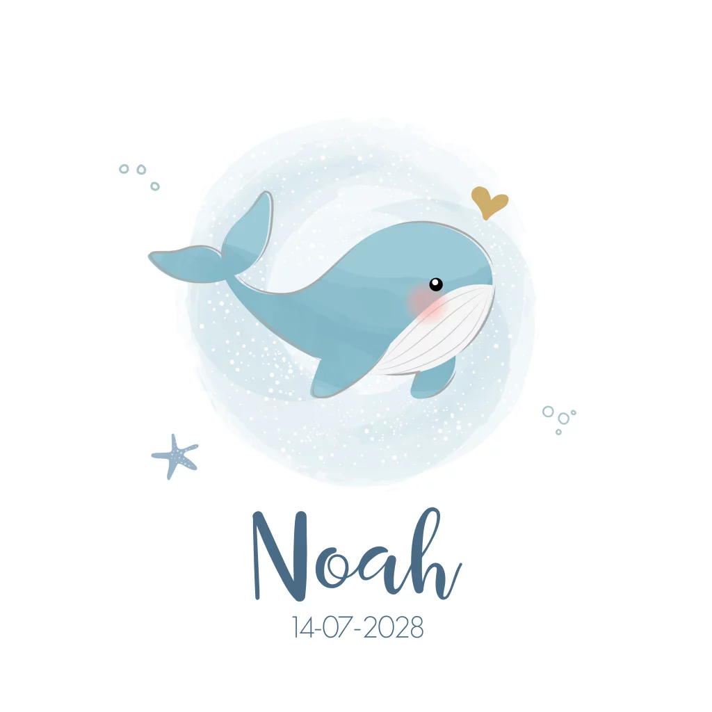 Supervrolijk, dit geboortekaartje voor een jongen met waterdieren! In een waterverf cirkel zwemt een blauw walvisje met een klein hartje erboven. Het lichtblauwe design op het witte kaartje komt ook terug aan de binnenzijde, de tekst is in bijpassende kleuren en pas je eenvoudig zelf aan in de online editor.