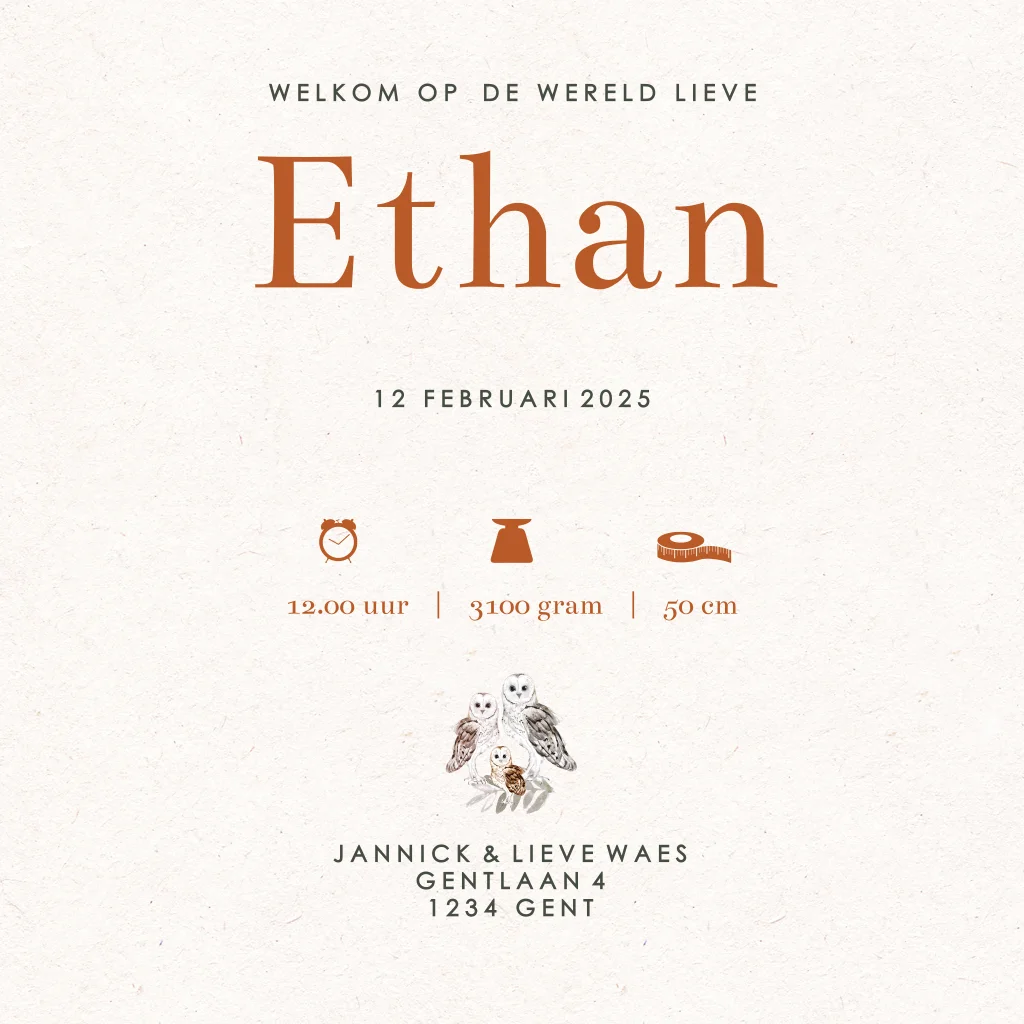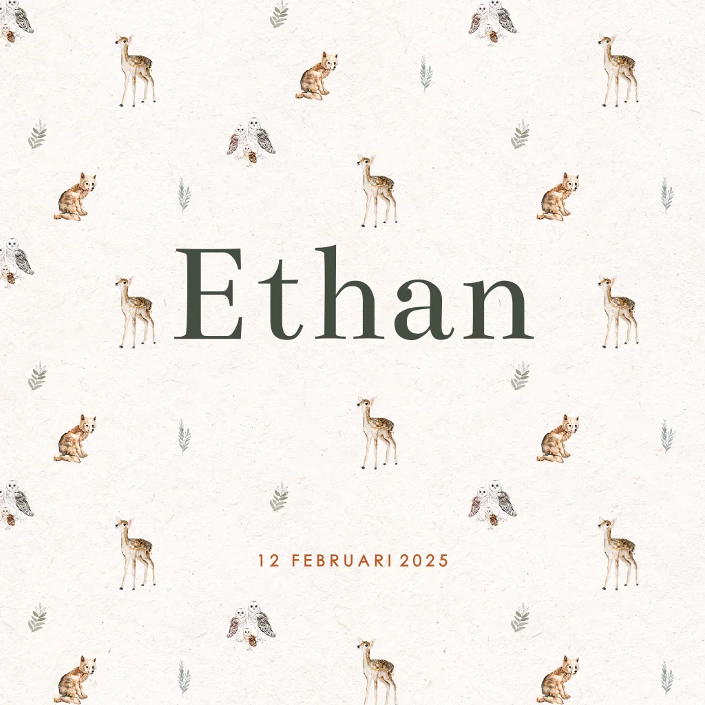 Dit geboortekaartje voor een zoontje in natuurlijke kleuren is erg stijlvol. Op het beige kaartje staat een patroon van hertjes, vosjes en uiltjes, maak dit eigentijdse kaartje naar wens in de online editor.
