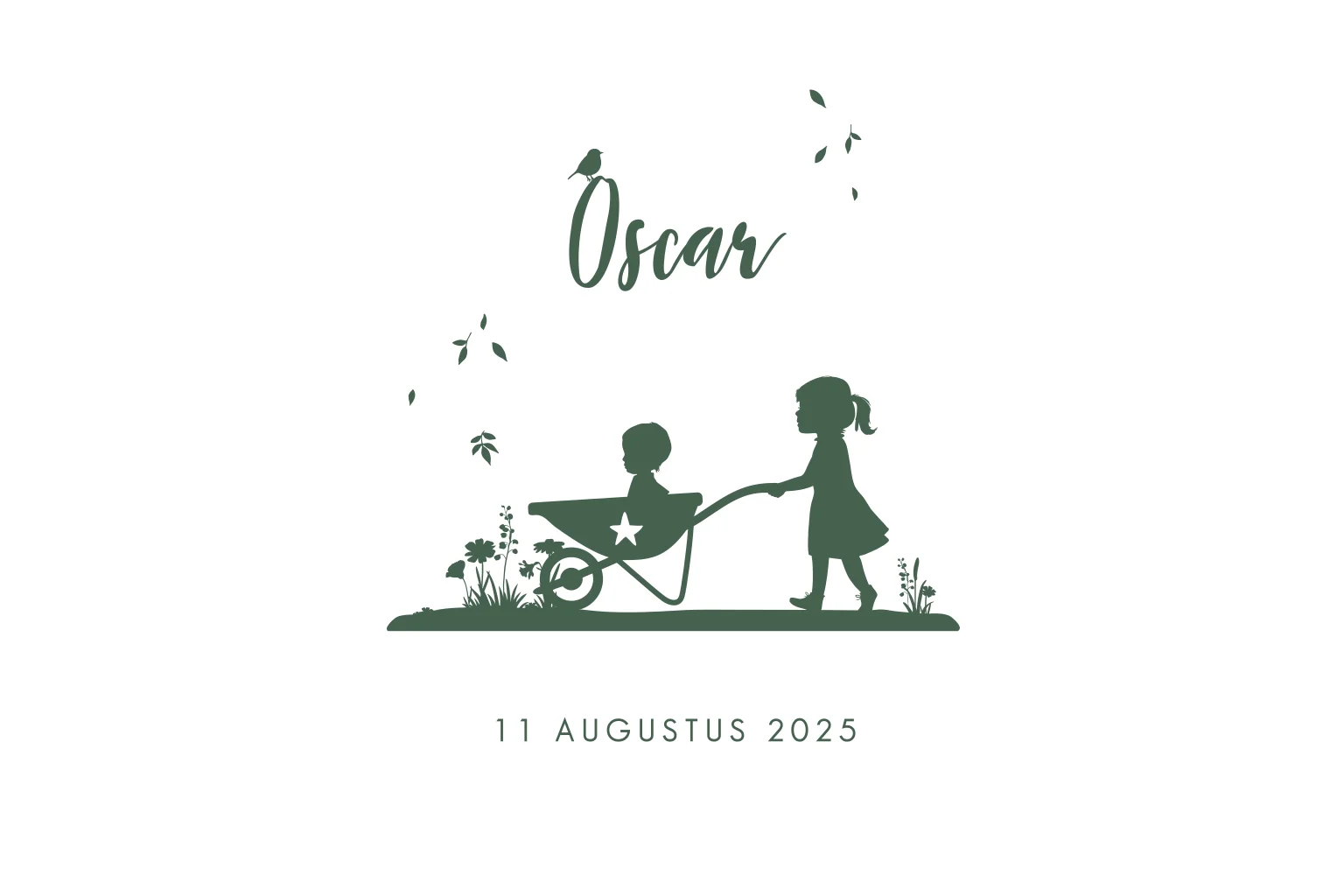 Geboortekaartje jongen met silhouet grote zus en broertje in kruiwagen