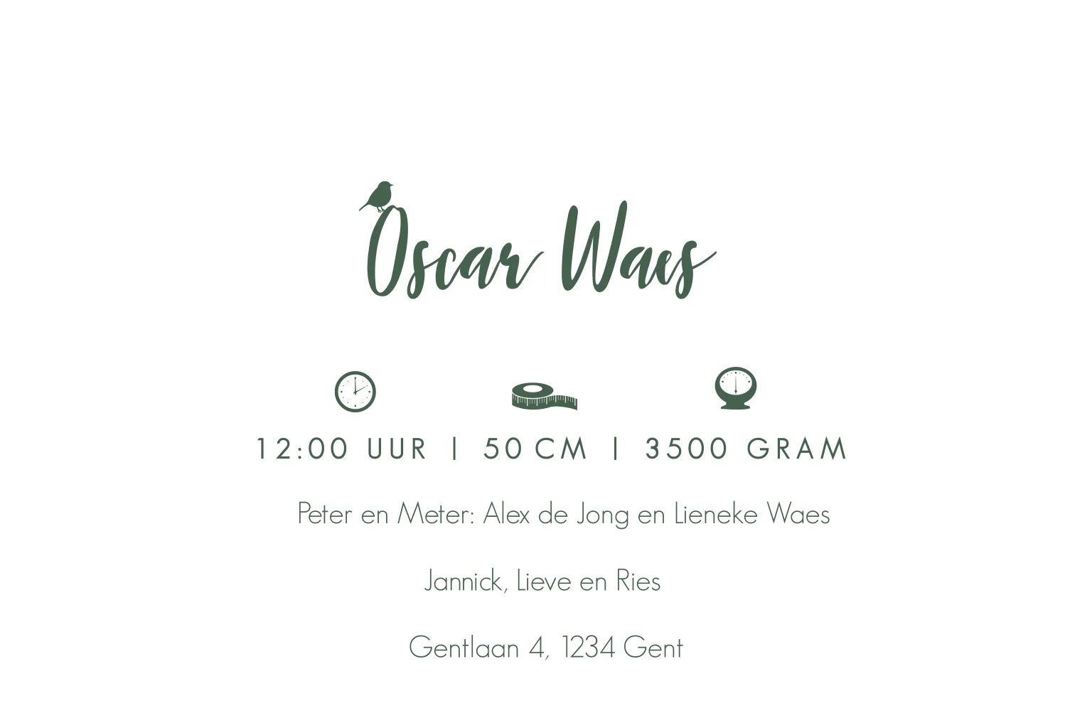 Geboortekaartje voor een baby broertje met een silhouet tekening in groen. Grote zus duwt de kruiwagen met haar kleine broertje door een landschap. Op de naam in hippe letters zit een vogeltje, grappig toch?!